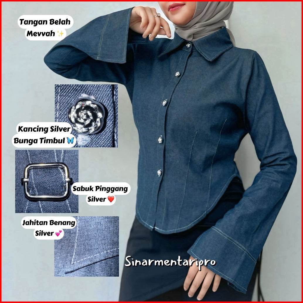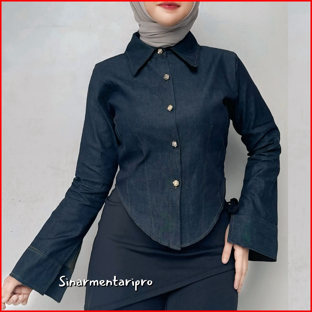 Smpro - Jeans Baju Kemeja Oval Jeans Kancing Bunga Baju Atasan Wanita Jeans Tebal Tangan Panjang -