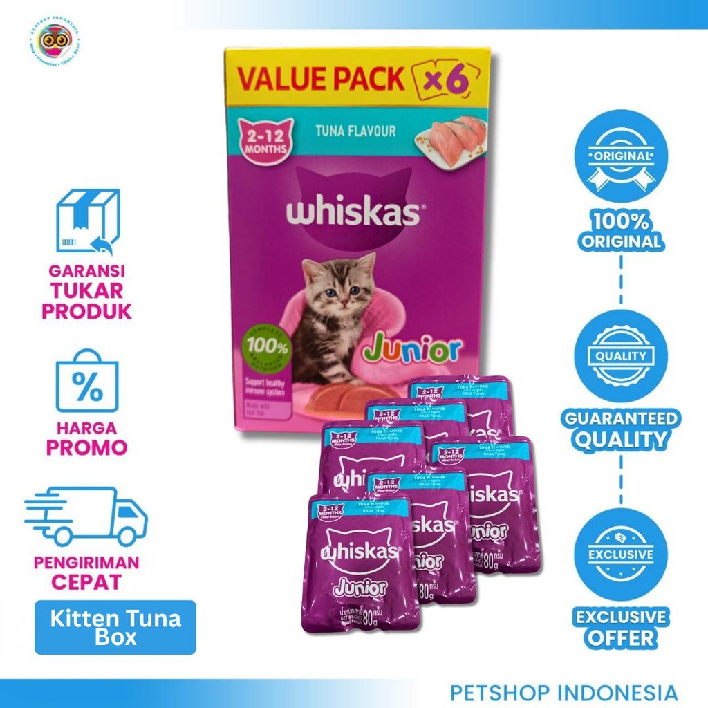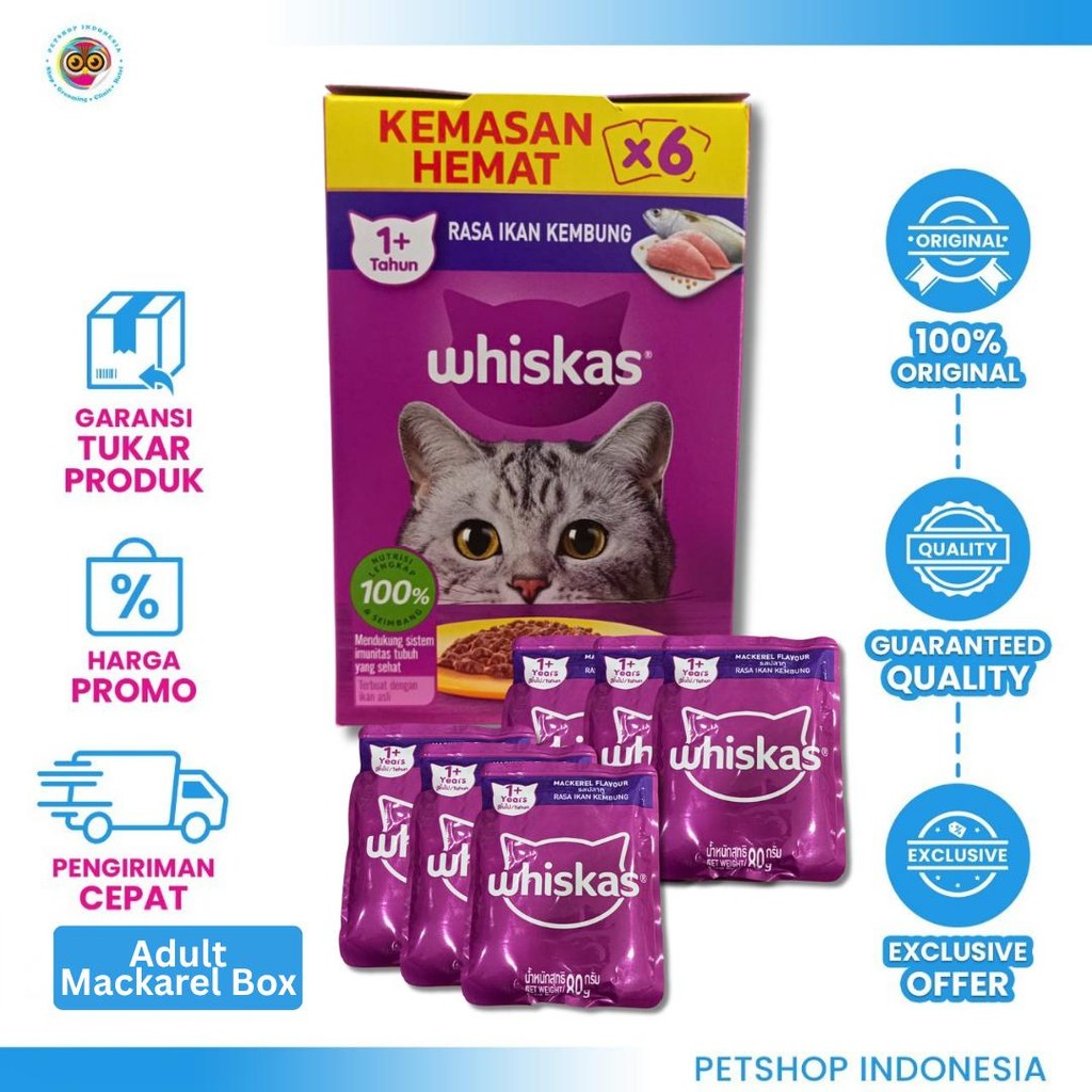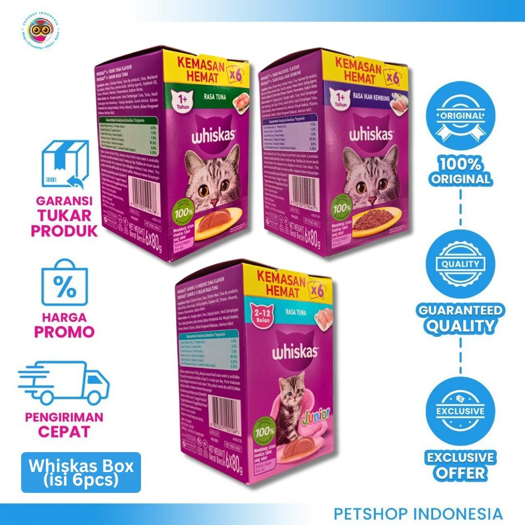 Whiskas Pouch 6pcs 80g - Makanan Kucing Basah Hemat Box - Tuna, Mackarel, Junior Adult