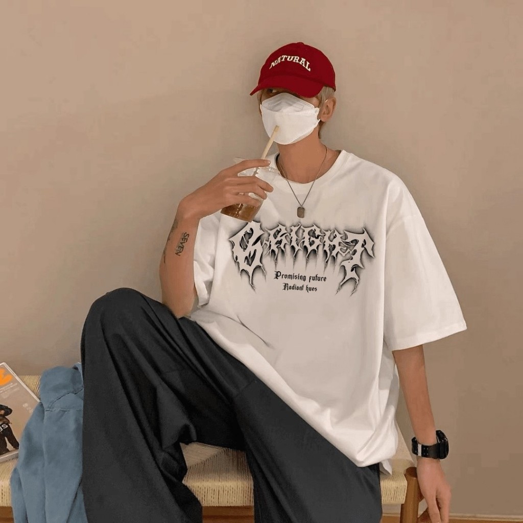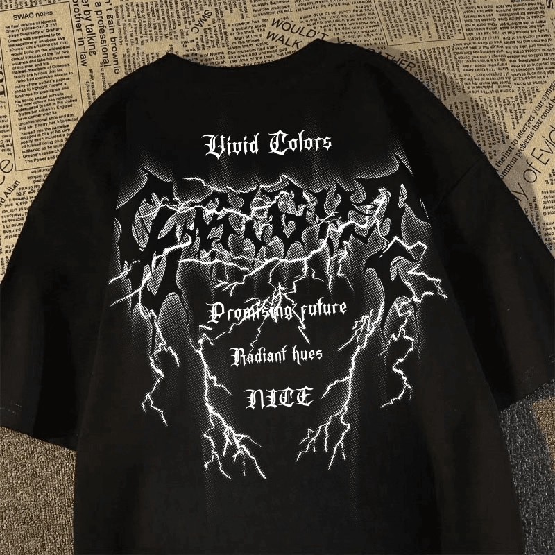 Kaos T - Shirt Motif Tulisan Metal & Petir, Gaya Streetwear Ins, Katun Murni Oversize Musim Panas