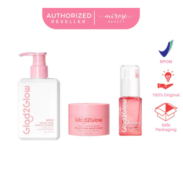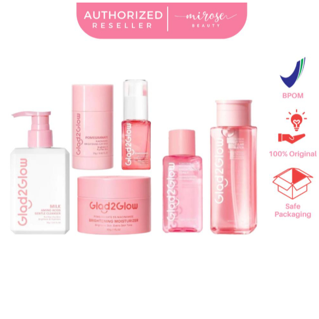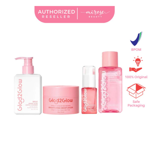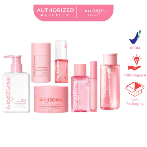 [1 PAKET] Glad2Glow Mencerahkan Bright Glowing Set | Serum | Moisturizer | Pomegranate Clay Stick | Lip Serum | Milk Amino Face Wash