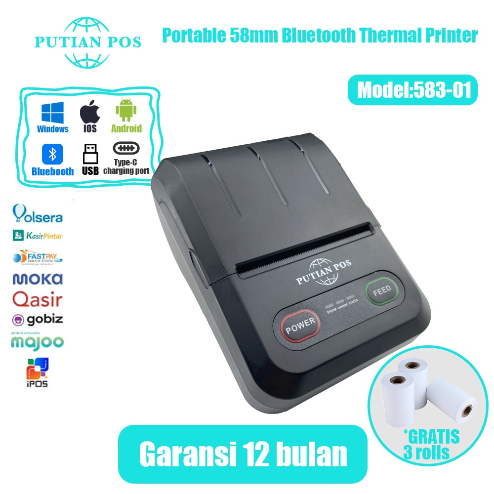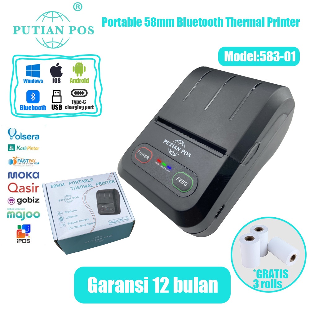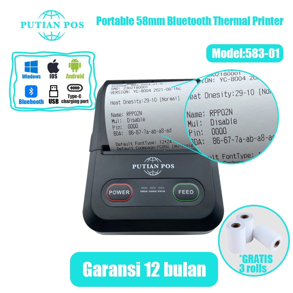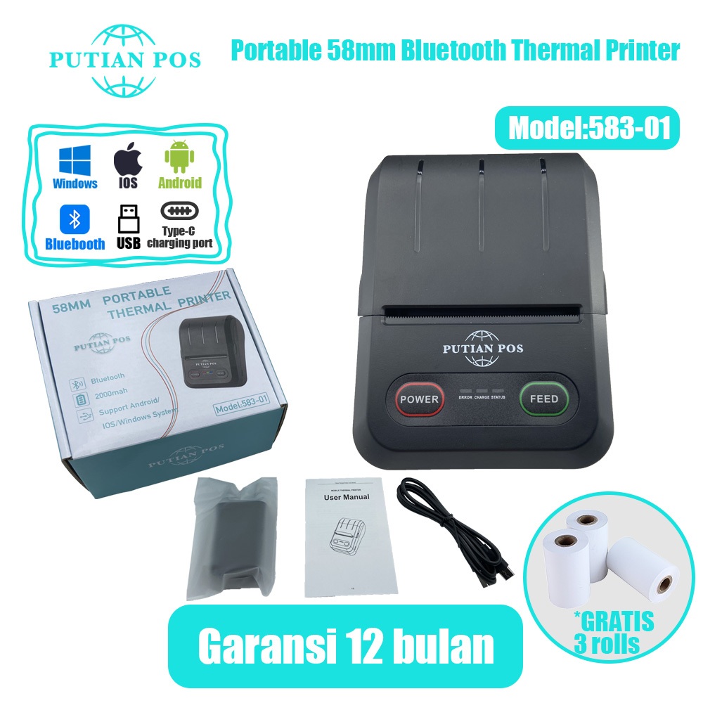 PUTIAN POS58mm Printer Termal Mini Portabel 583-01 Printer Termal Mesin Kasir (Dengan Baterai)