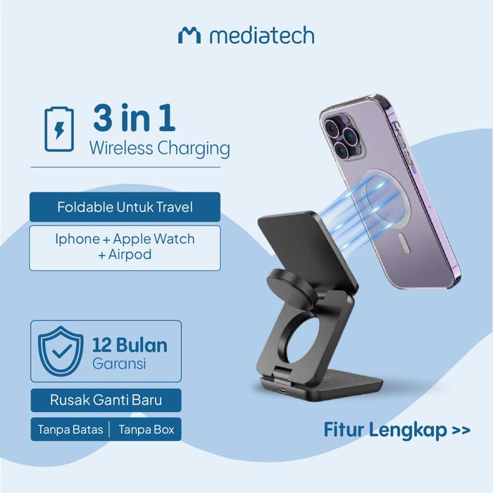Mediatech Dudukan Pengisi Daya Nirkabel Magnetik 3-in-1 iw30 669285 Pro 15W Foldable untuk iPhone