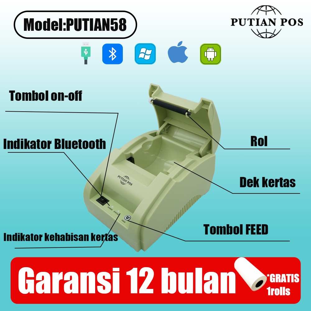 LUTIAN POS Desktop Thermal Printer PUTIAN 58 rinter Tanda Terima (Bluetooth+USB)