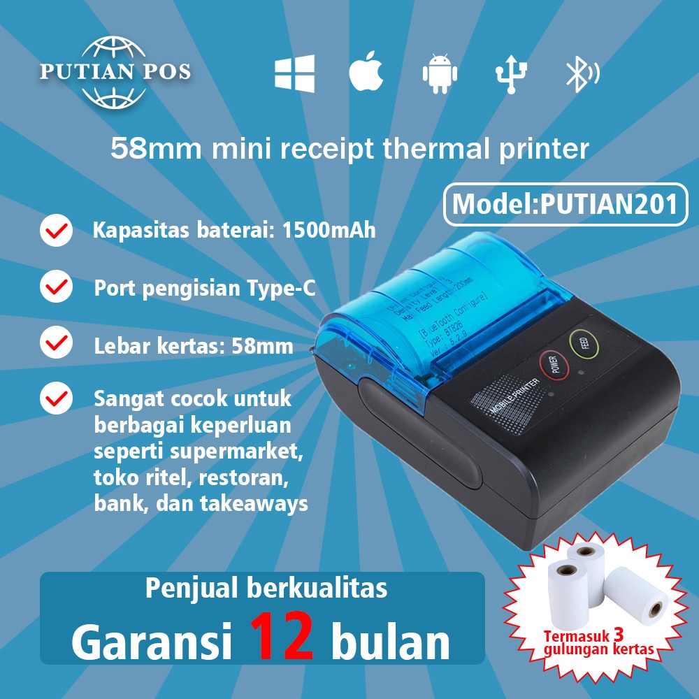 PUTIAN POS Printer Portabel 58mm Bluetooth Printer PUTIAN201 Mesin Cetak Kasir (dengan Baterai)