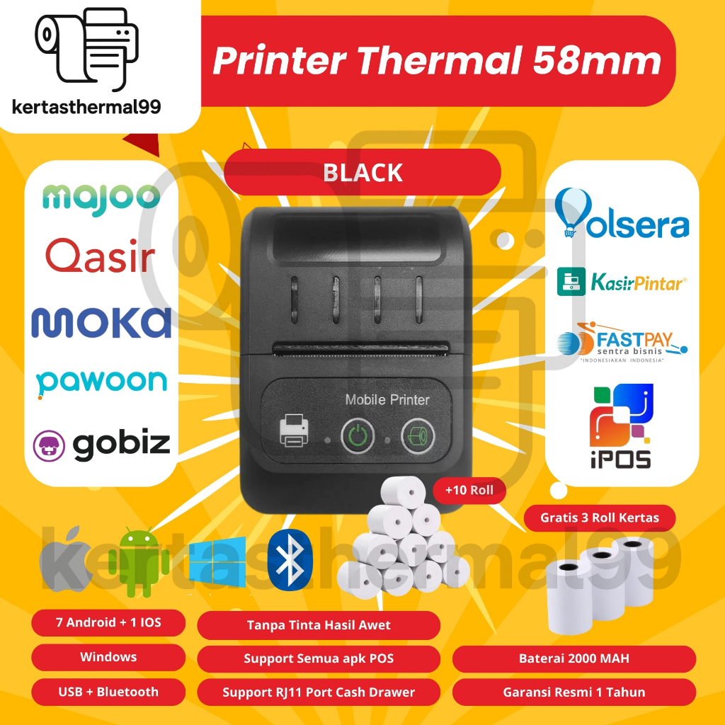 PRINTER BULETOOTH MINI PRINTER KASIR 58mm Printer Thermal support Android/ios/Windows Bluetooth +USB free gift 3 rol ker