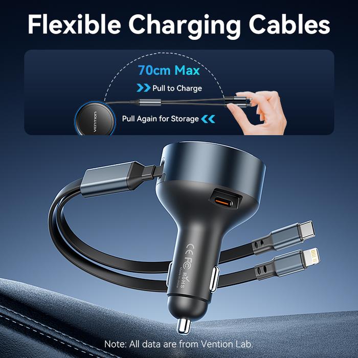 Vention 2in1 Car Charger 30W with Built-In Type C & Lightning Cable for iPhone Android