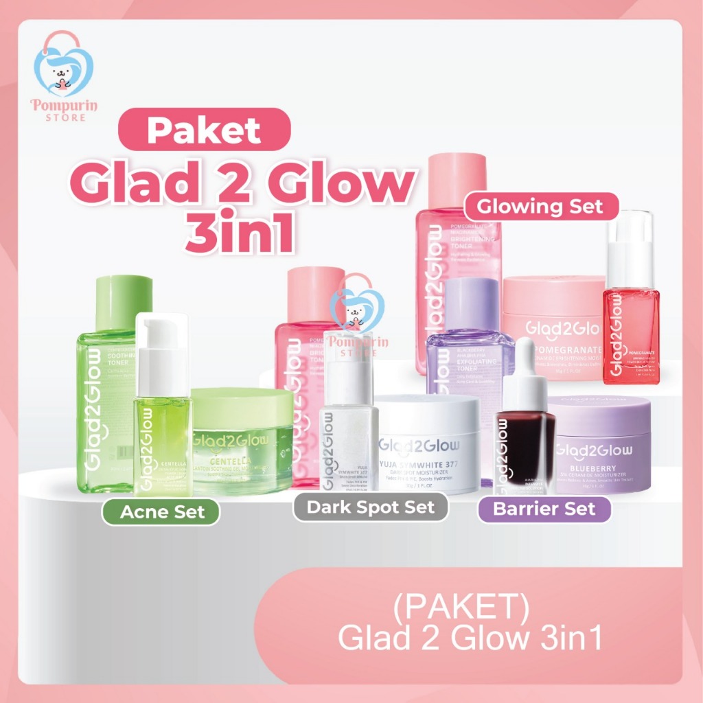 (PAKET) Glad2Glow 3in1 - Glowing Set / Barrier Set / Acne Set, Dark Spot Set / Glad 2 Glow Bundling 3pcs