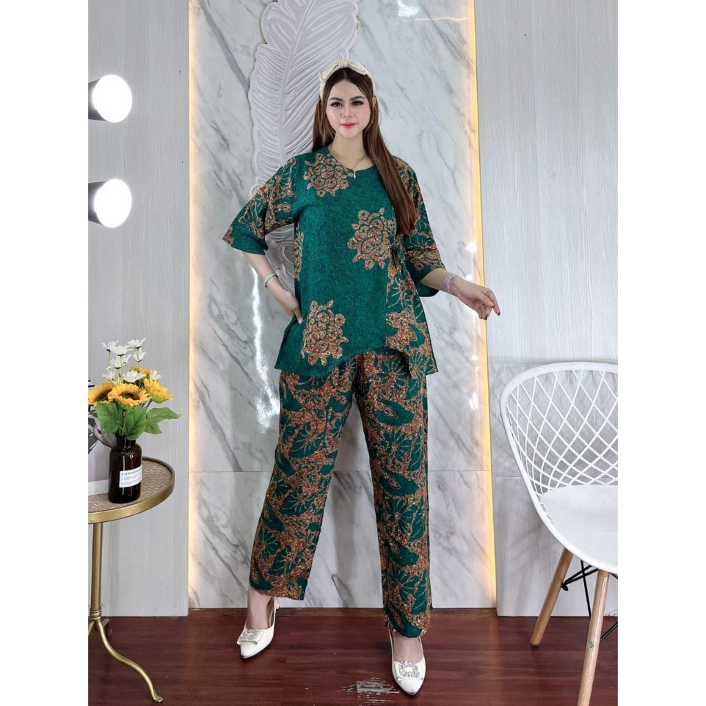 Setelan Batik Cap Pola Bunga Dewasa Lengan 34 Tali Samping Terbaru One Set Kekinian Santung Premium Pakaian Piyama Wanita Busui