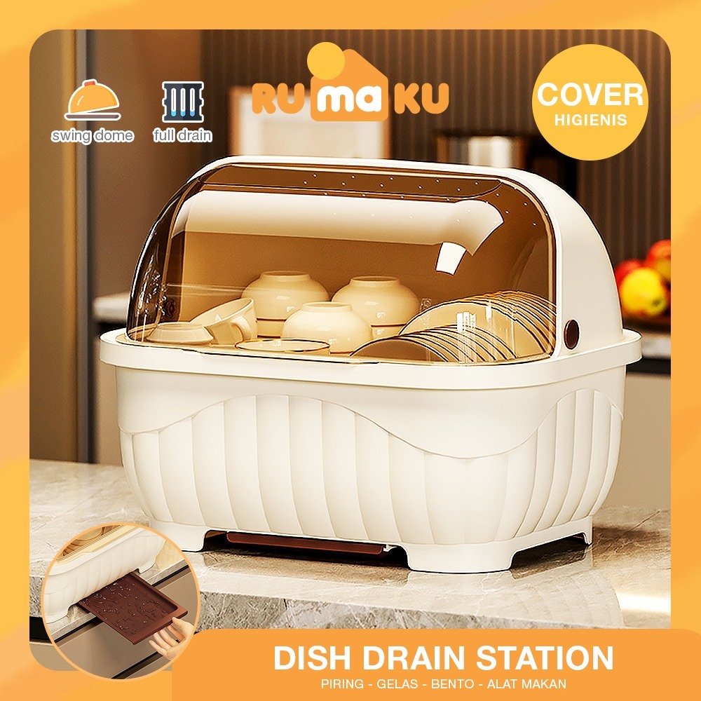 Rumaku Rak Piring Plastik Dengan Tirisan Air Dan Tutup Transparan Tempat Penyimpanan Mangkuk Garpu Sumpit Anti Debu