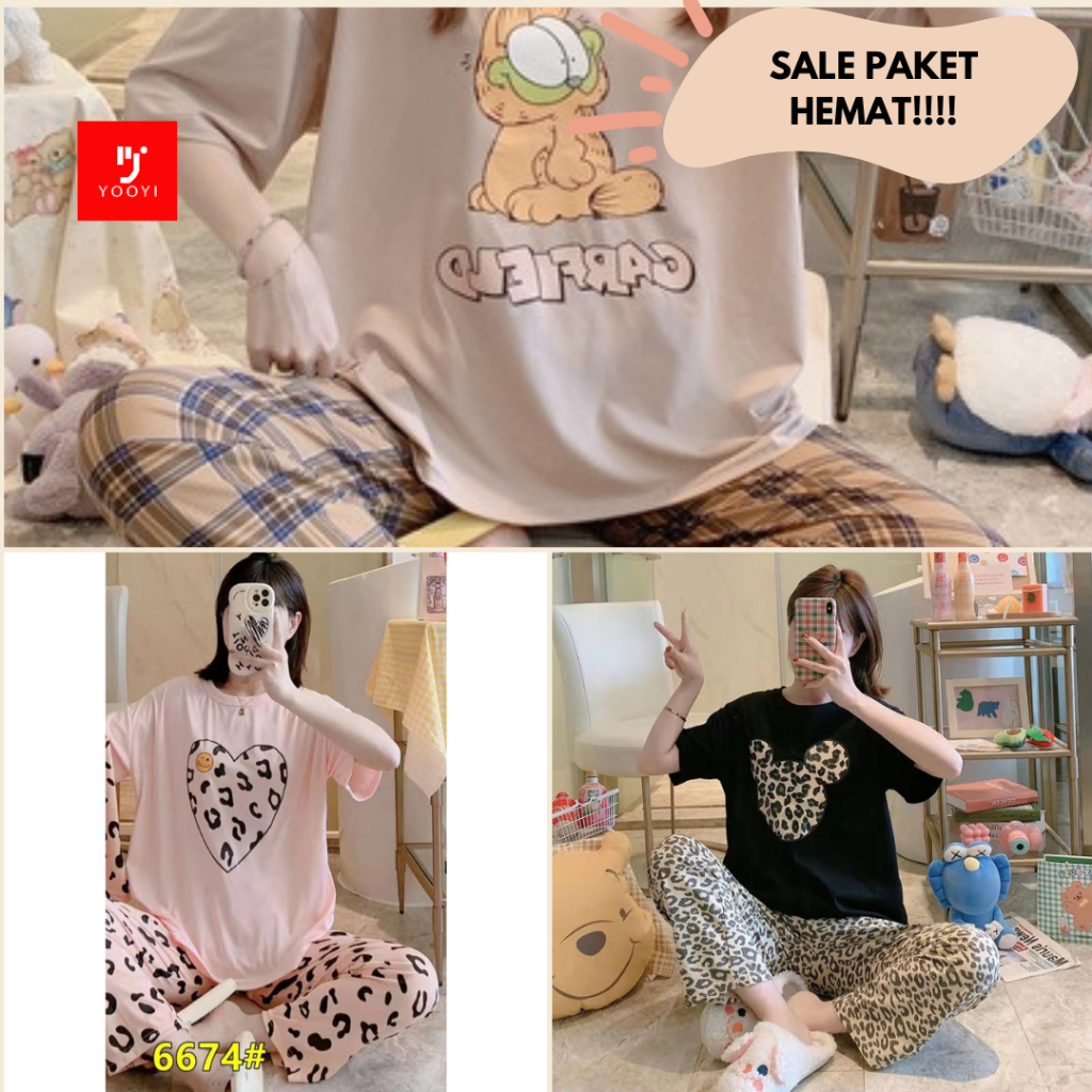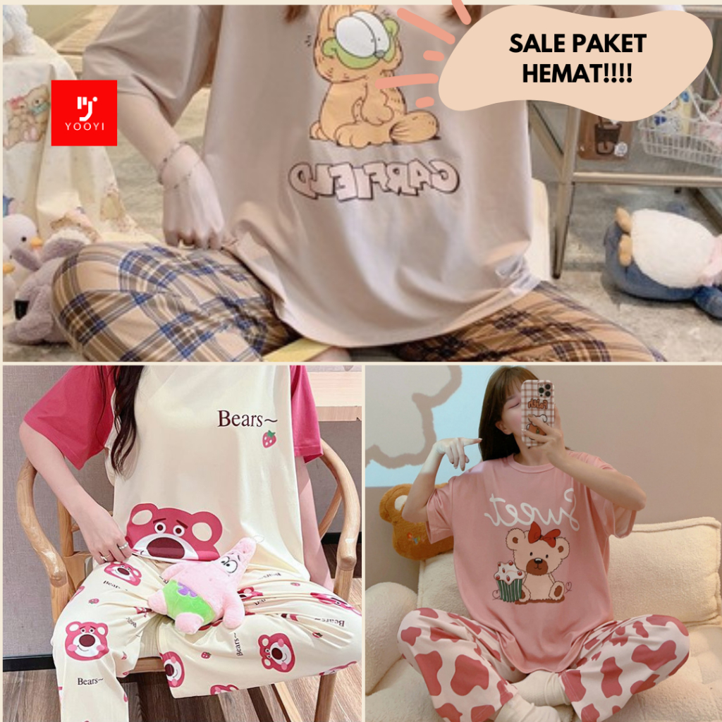 Yooyi Paket Bundle 3 Baju Tidur Wanita Piyama Korea Lengan Pendek Celana Panjang Motif Kartun Lucu Setelan Tidur Murah Model Kaos Korea