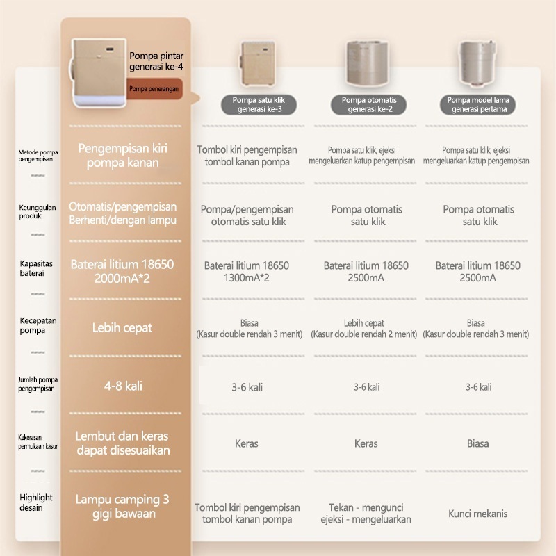 190*100*25(2600Mah), 190*100*40(4000Mah), 200*100*25(2600Mah), 200*152*40(4000Mah), 200*180*25(4000Mah), 200*180*40, ⭐190*150*65CM, Pompa otomatis