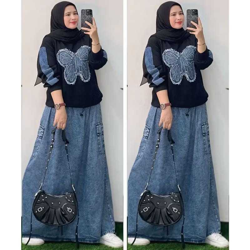 LOVILA SETROK , SETELAN UKURSN STANDAR & JUMBO , SETELAN ROK JEANS ARASAN COMBRT 24S, SETELAN KEKINIAN