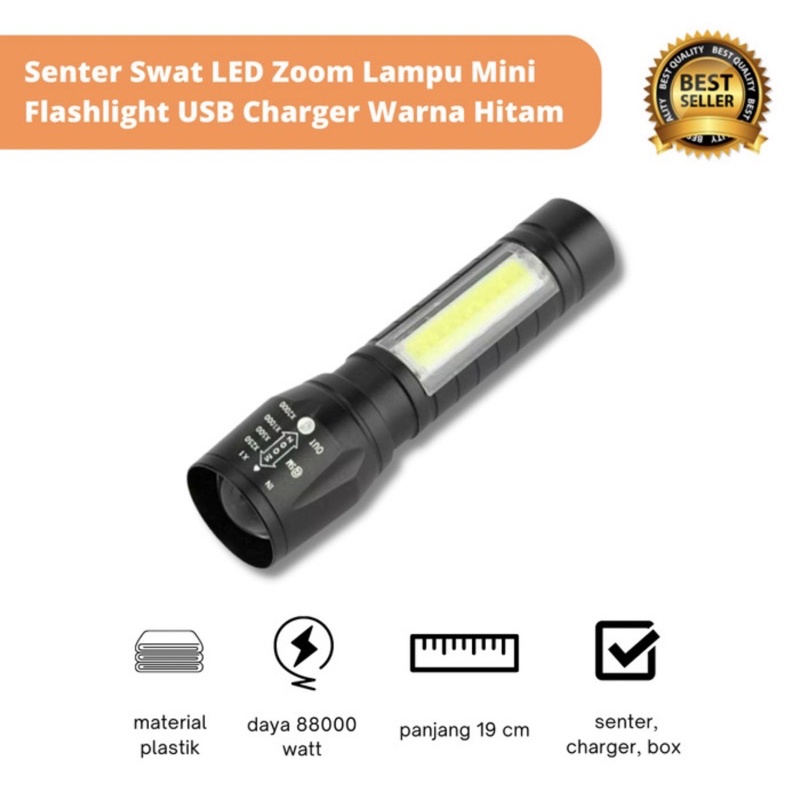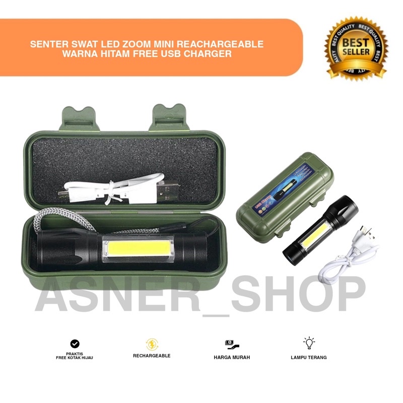 SENTER TANGAN MINI SWAT POLISI LED CAHAYA TERANG RECHARGER WARNA HITAM PACKING KOTAK