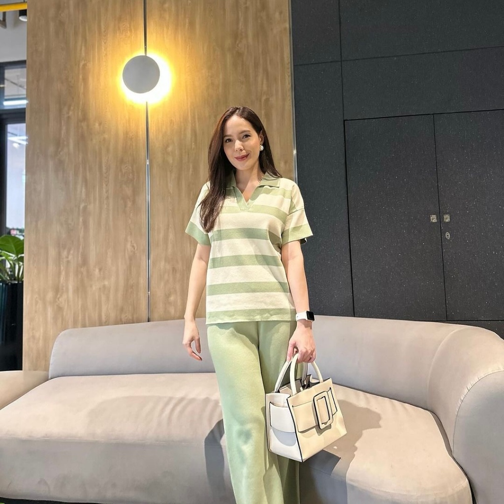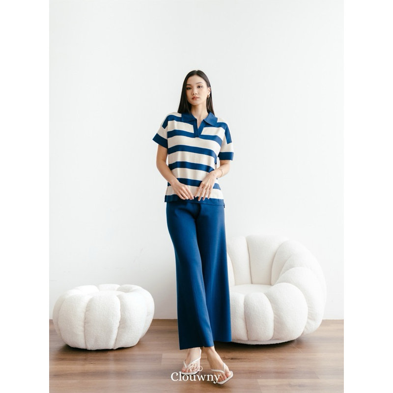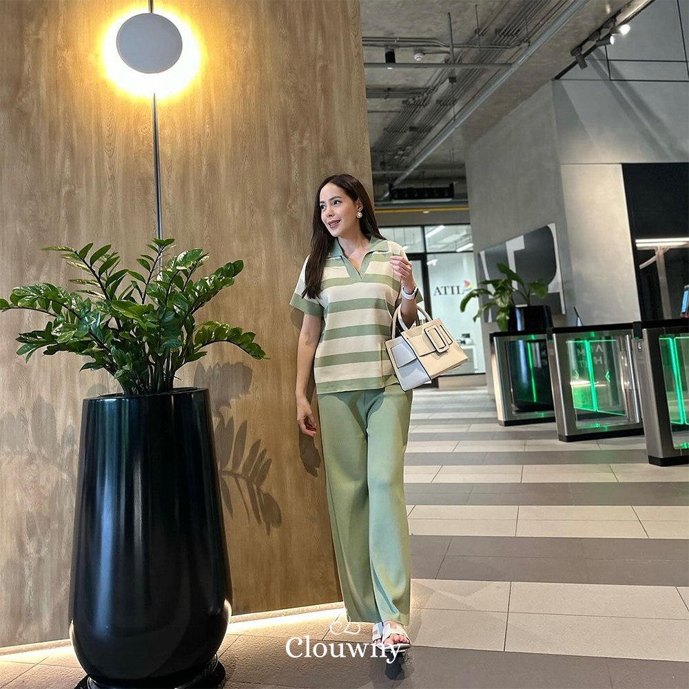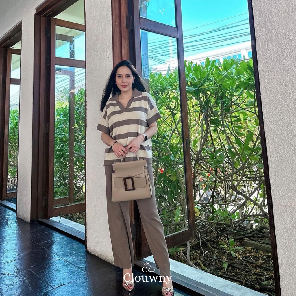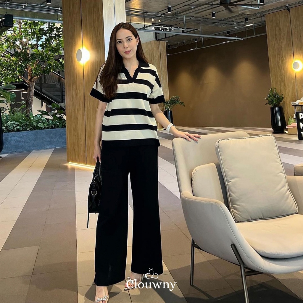 Clouwny Minjoo Stripes Set Daily Outfit Top Lengan Pendek Celana Panjang Highwaist Premium Knitt