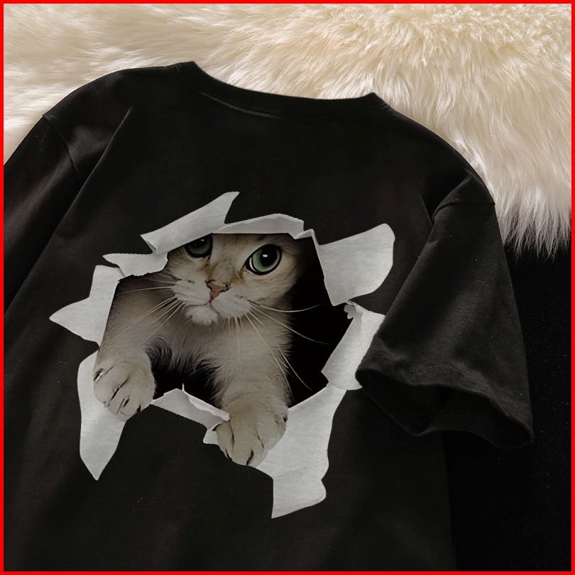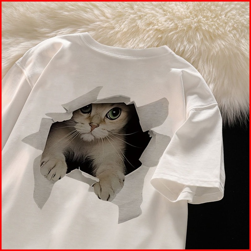 Po Floret Kaos Oversize Lengan Pendek T-shirt Hole Cat Katun Murni Korean Style Wanita Top