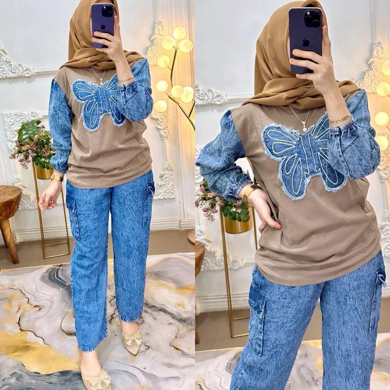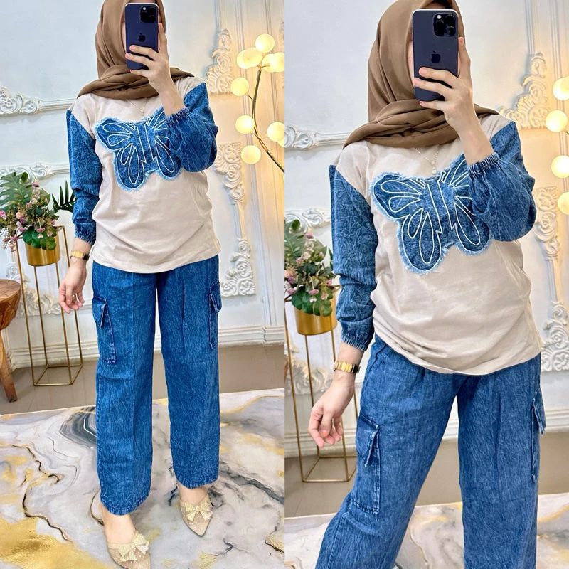Setelan Jeans Wanita Kekinian Oneset Jeans Kupu kupu Kombinasi Kaos Wanita Setelan Kaos Wanita Terbaru Setelan Kupu-Kupu Jeans