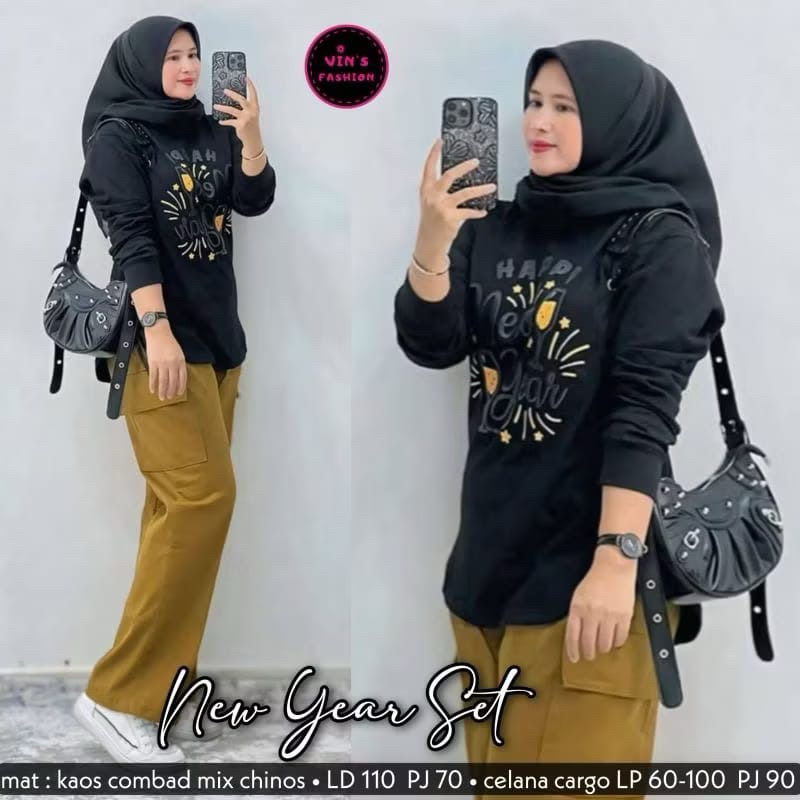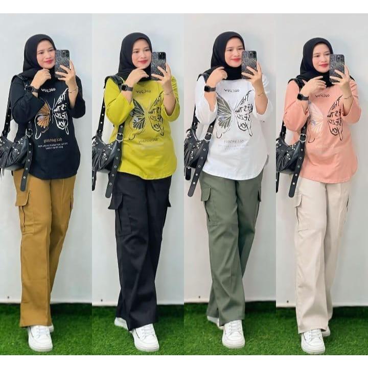 Setelan Chinos Wanita Dewasa, Atasan Combed 24s Celana Chinos Kulot Cargo, Setelan Wanita Terpopuler Terkini
