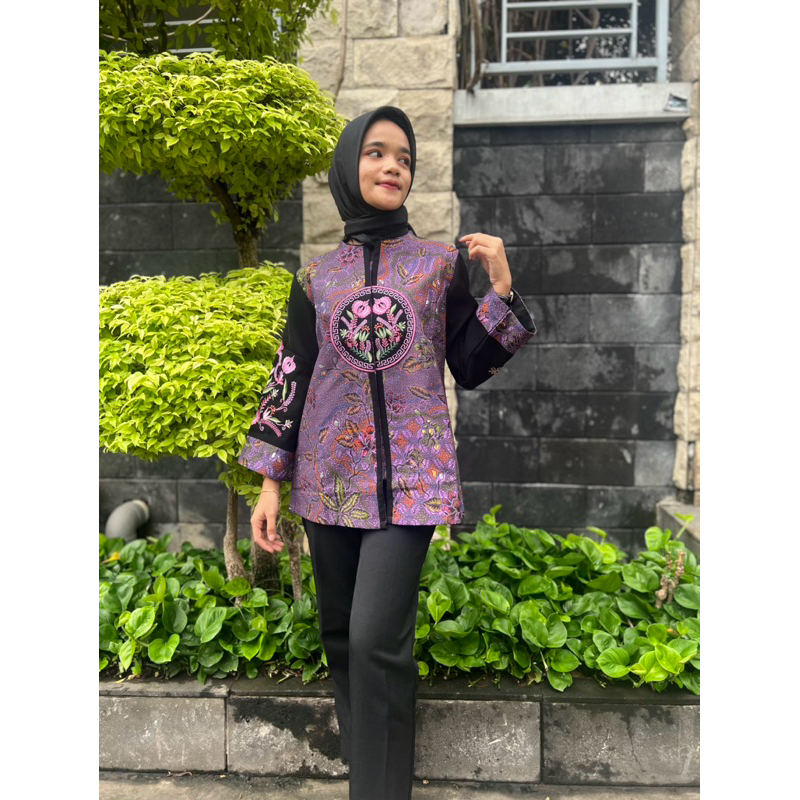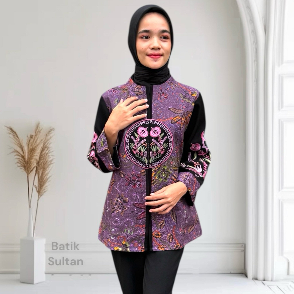 Atasan Batik Blouse Wanita Kain Katun Premium Hand Print Bordir Elegan Lapisan Furing Tricot Waffle l Blouse Cewe Kondangan Kantor Kerja F