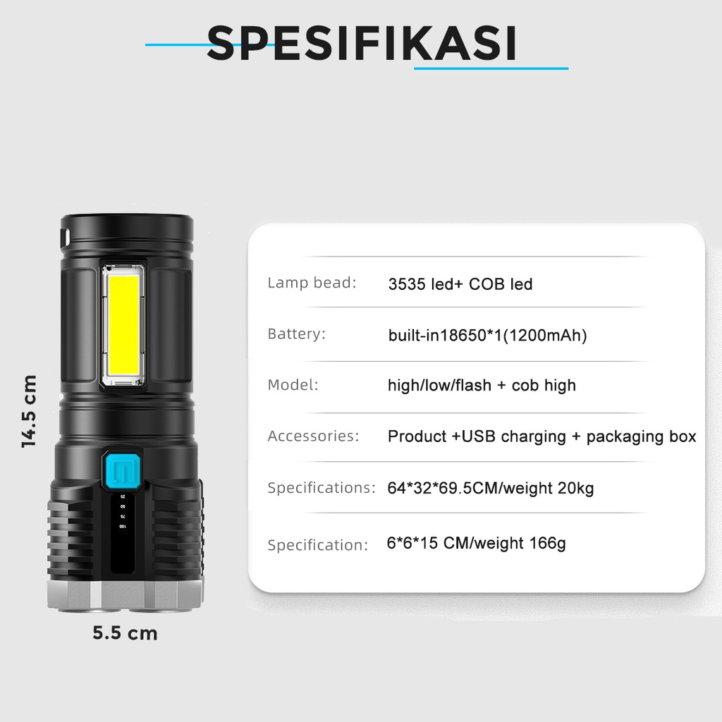 SUKSESTECH SENTER LED COB FLASHLIGHT SENTER CAS CHARGEABLE WATERPROOF 3 MODE L-19
