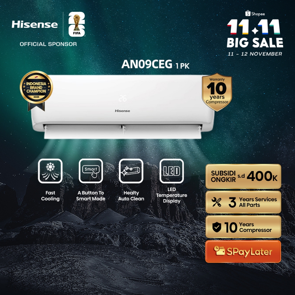 Hisense AC AN09CEG Standard 1 PK Dingin Kilat Cocok Untuk Kamar Tidur Pendinginan Super Cepat 3 Menit Sejuk Auto Clean Anti Bakteri Bisa Mode Tidur Smart LED Air Conditioner (Indoor & door Unit Only)