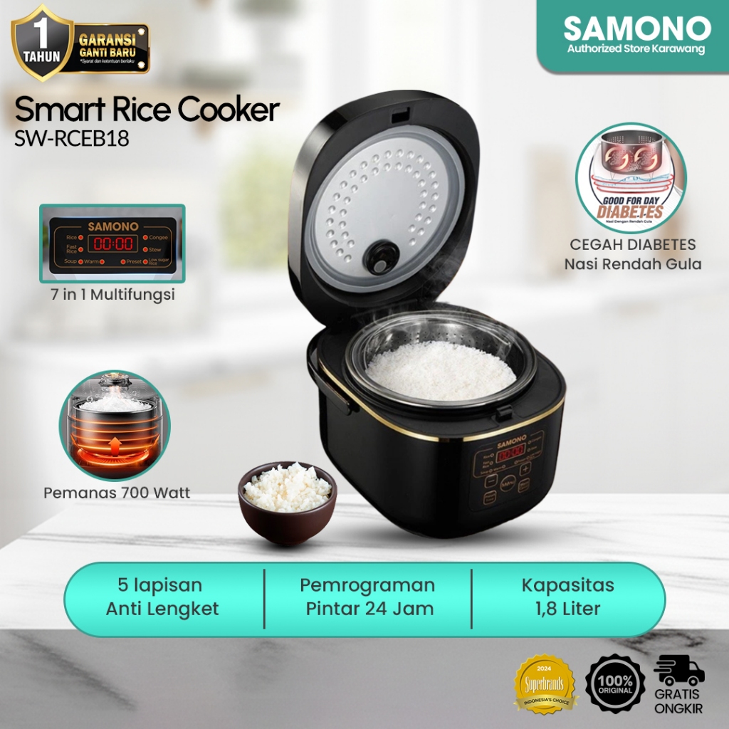 Samono Official Rice Cooker Rendah Gula Multifungsi Digital Kapasitas 1.8 Liter 7 Fungsi Memasak Garansi 1 Tahun Sw-Rceb