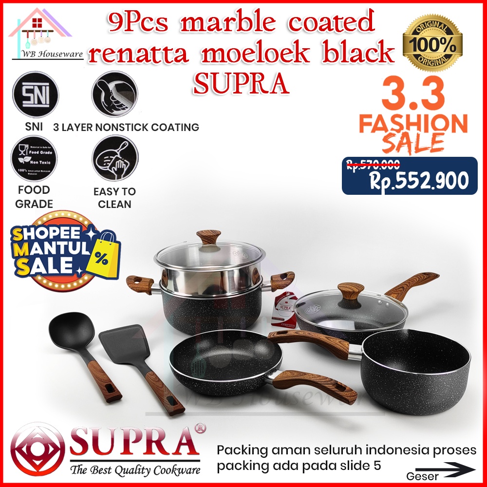 panci set supra 9pcs black renatta moeloek anti lengket wooden series / cookware set 9pcs