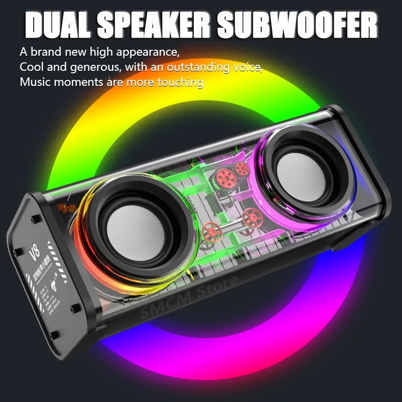 Mecha Speaker Bluetooth Subwoofer Baja Kecil Transparan Audio Portabel Nirkabel Rgb 7 Color Light V8 Speaker Bluetooth