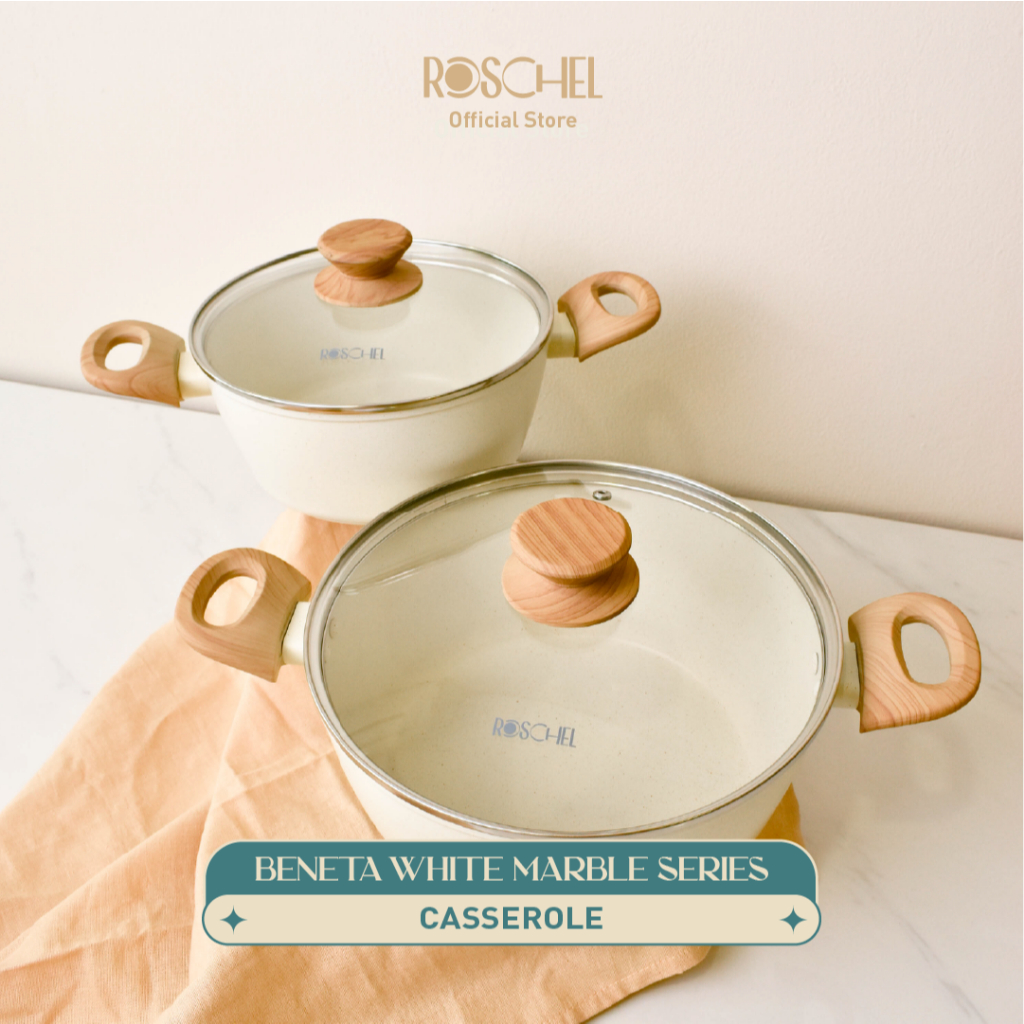 Roschel Beneta White Marble Coating Non-Stick Casserole 20 , 24, 28 cm + Tutup Kaca Panci Wajan Penggorengan Dutch Oven Anti Lengket Induksi Putih