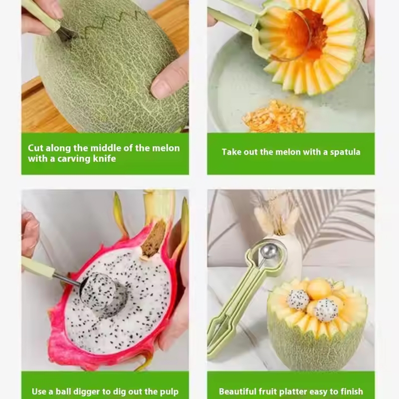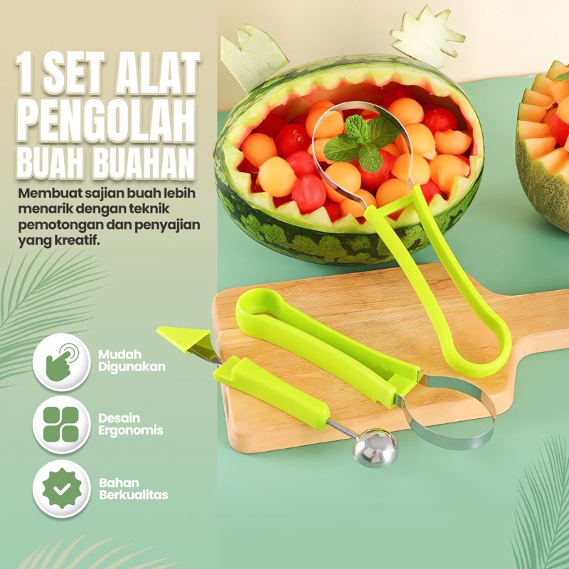 Queen 3 IN 1 Alat Dekorasi Buah Multifungsi Pemotong Buah Cocktails Fruit Ball Digger Kerokan Buah Pengupas Kulit Buah