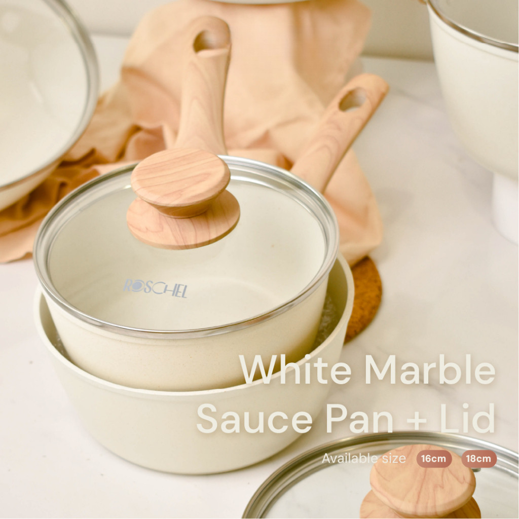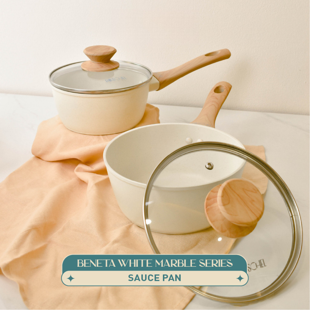 Beneta White Marble Coating Non-Stick Saucepan 16 , 18 cm + Glass Lid Non-Stick Milk Pan Sauce Pan White Induction Non-Stick Frying Pan
