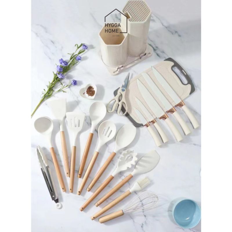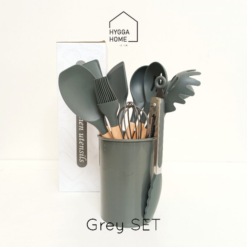 Hygga Home SET Silikon Sutil Pencapit Spatula Kuas Sendok Gagang Kayu/Silicone Kitchen Utensils SET