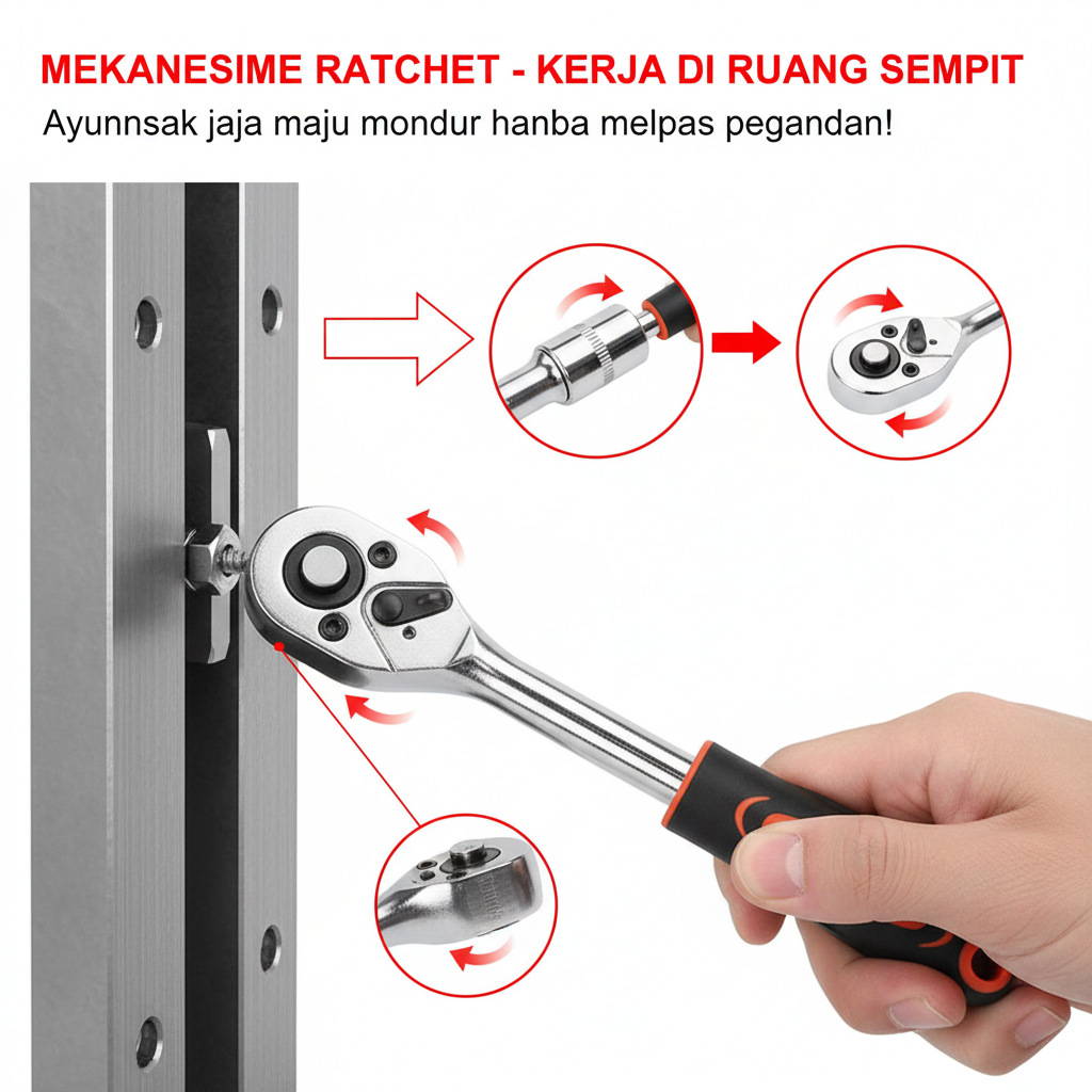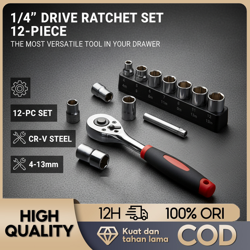 【KIRIM HARI INI】Kunci Sok Set 1/4" 12PCS CR-V - Kunci Ratchet / Pas Ringan & Tahan Lama untuk Perawatan Mobil Motor, Per