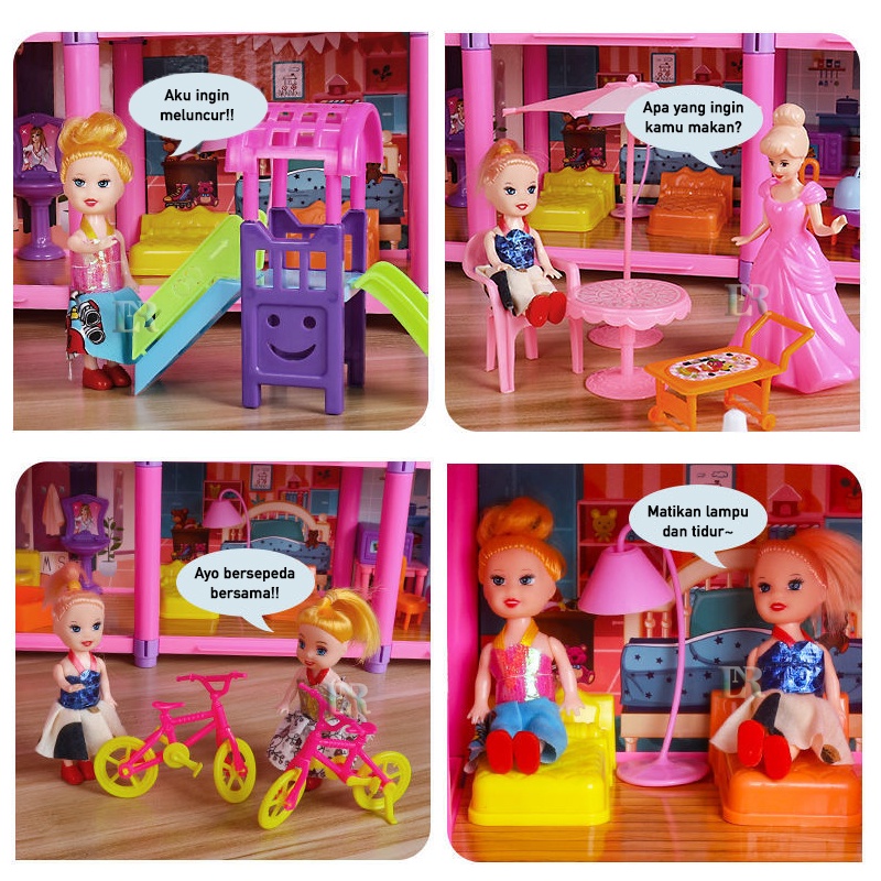 LNR Shop 259 pcs Set Mainan Rumah Rumahan 4 Lantai Boneka Barbie + Lampu LED Mini Villa Dream Home Import Ukuran Besar D