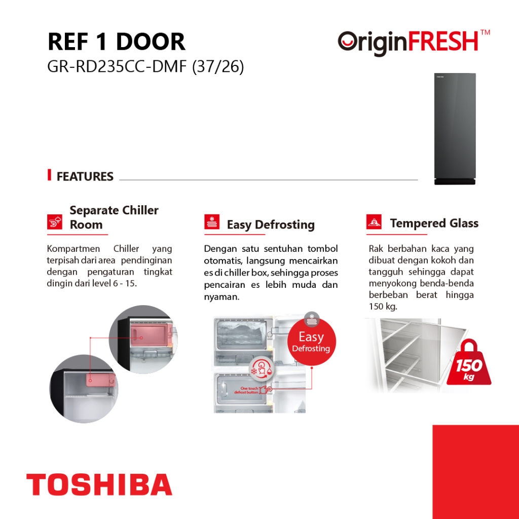 KULKAS 1 PINTU TOSHIBA GRRD235CC-DMF37 KAPASITAS 181 151 LITER LEMARI ES LOW WATT GARANSI RESMI PROMO MURAH