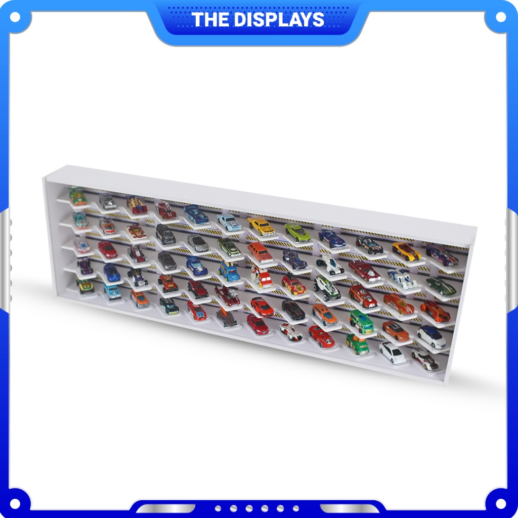 Rak Display Hotwheels Serong PVC Board Kapasitas 60 Mobil dengan Background