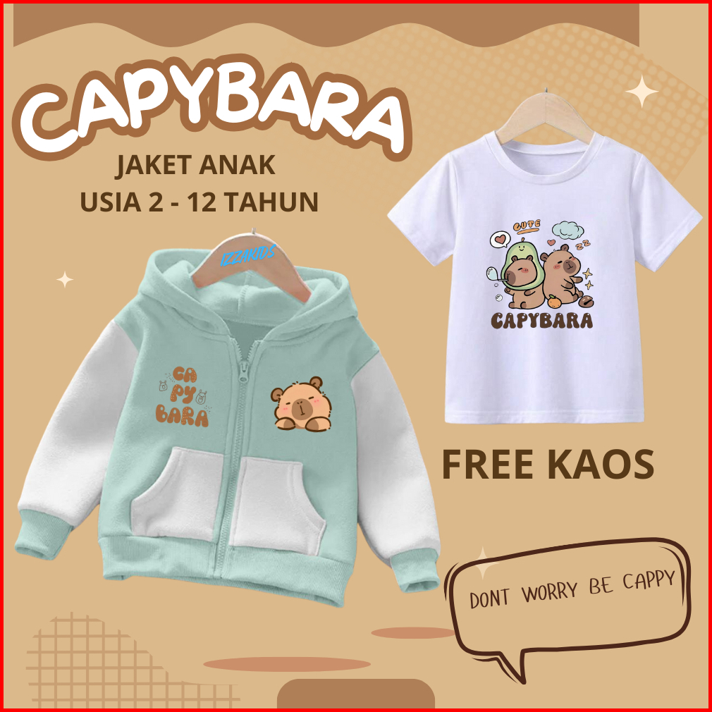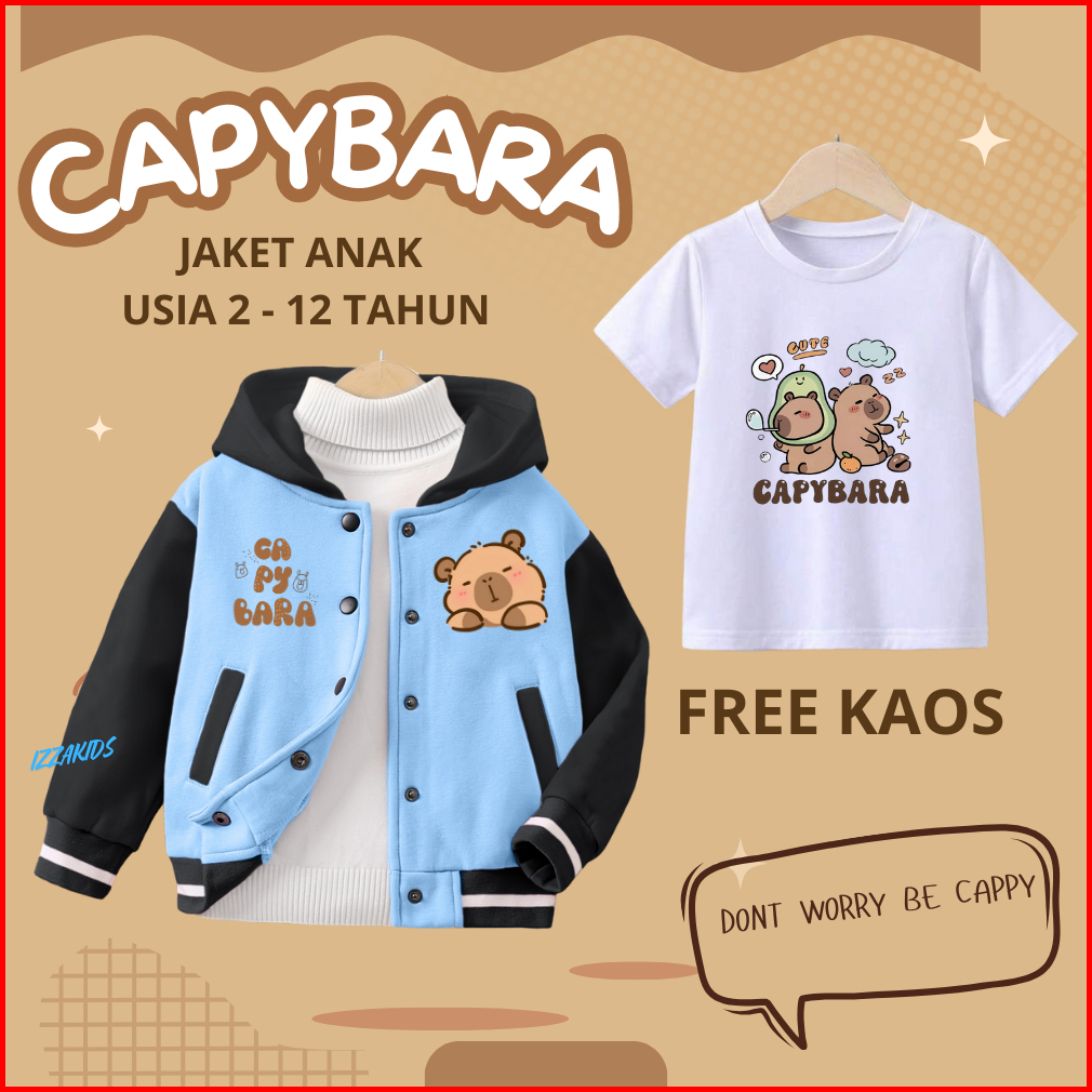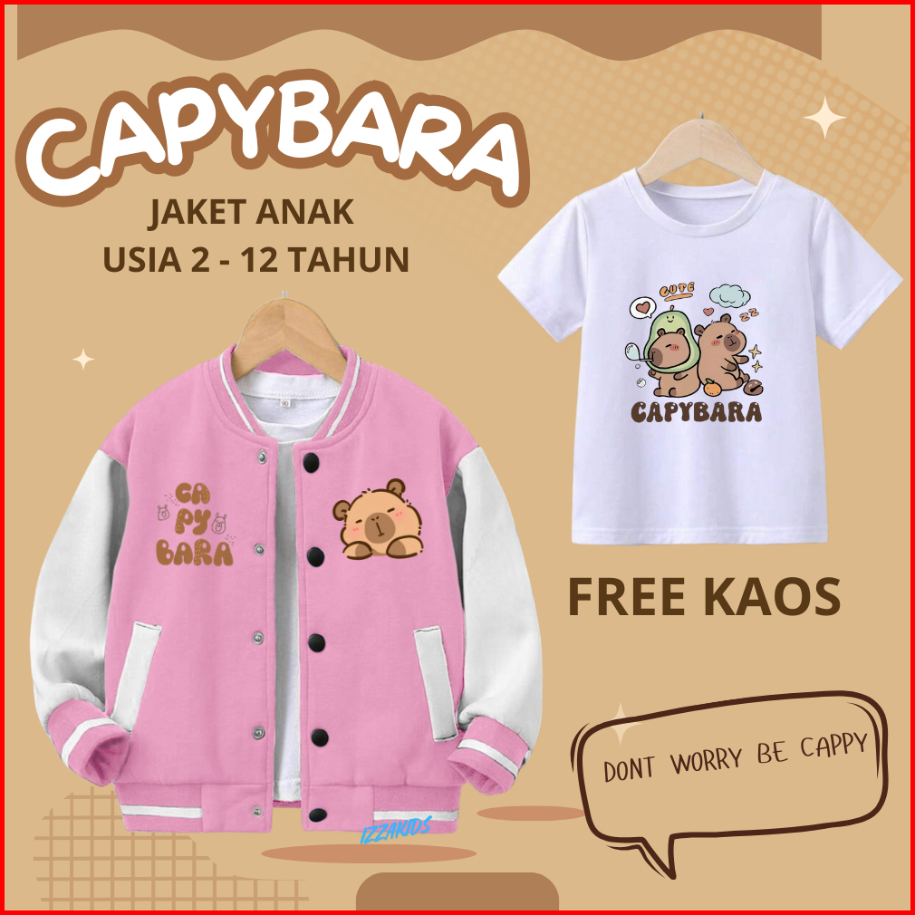 Jaket Anak Capybara Cute Laki-laki Perempuan Usia 2 - 12 Tahun Jaket Zipper Varsity Baseball