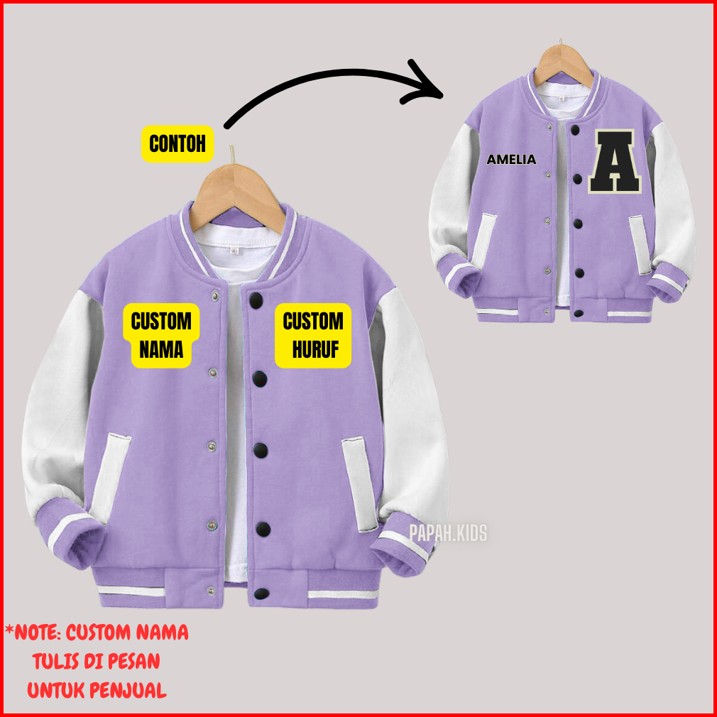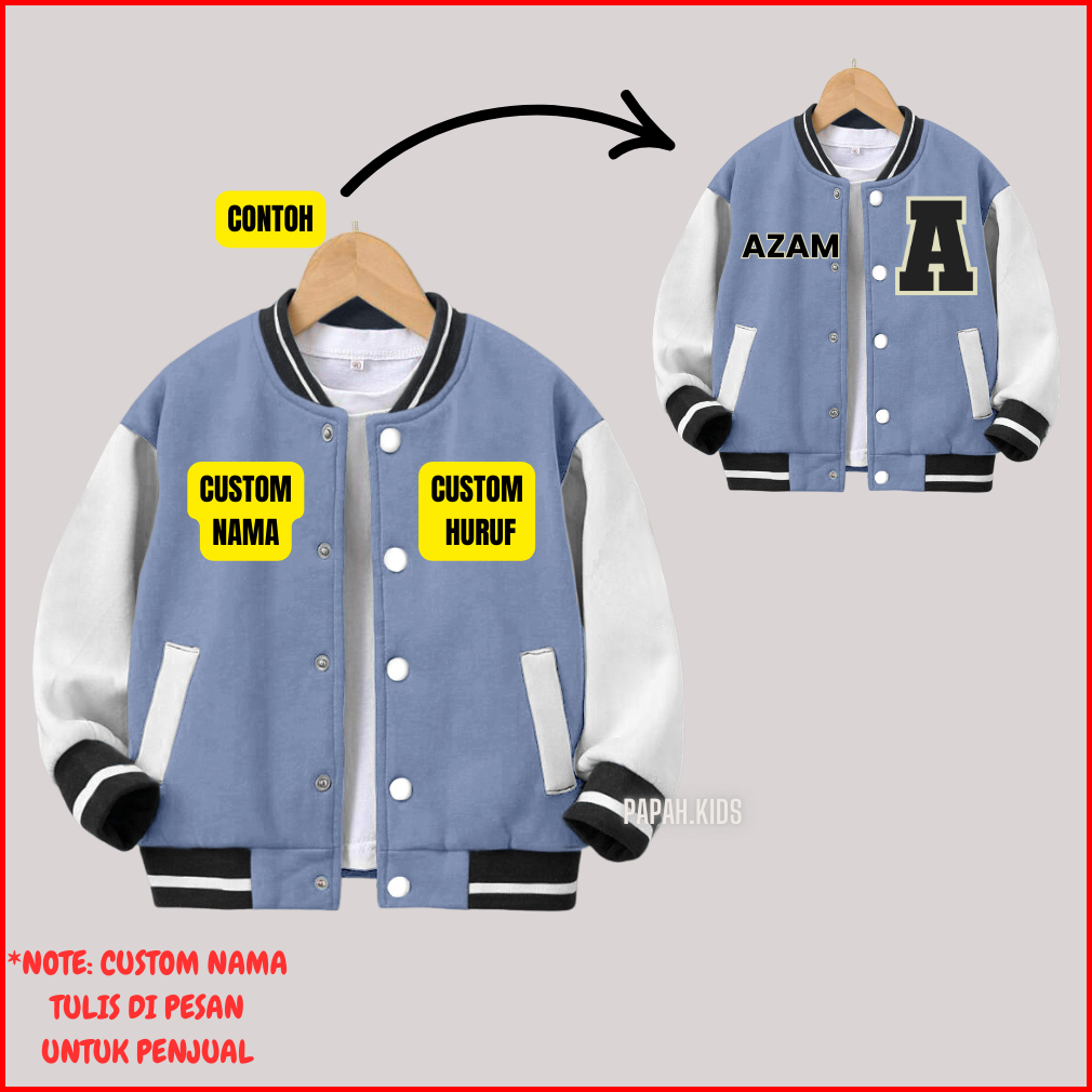 Jaket Anak Laki Laki Perempuan Custom Inisial Nama Usia 2 - 12 Tahun Jaket Varsity Baseball