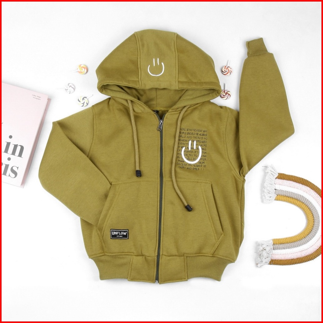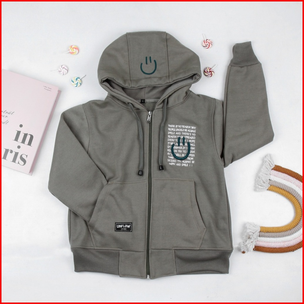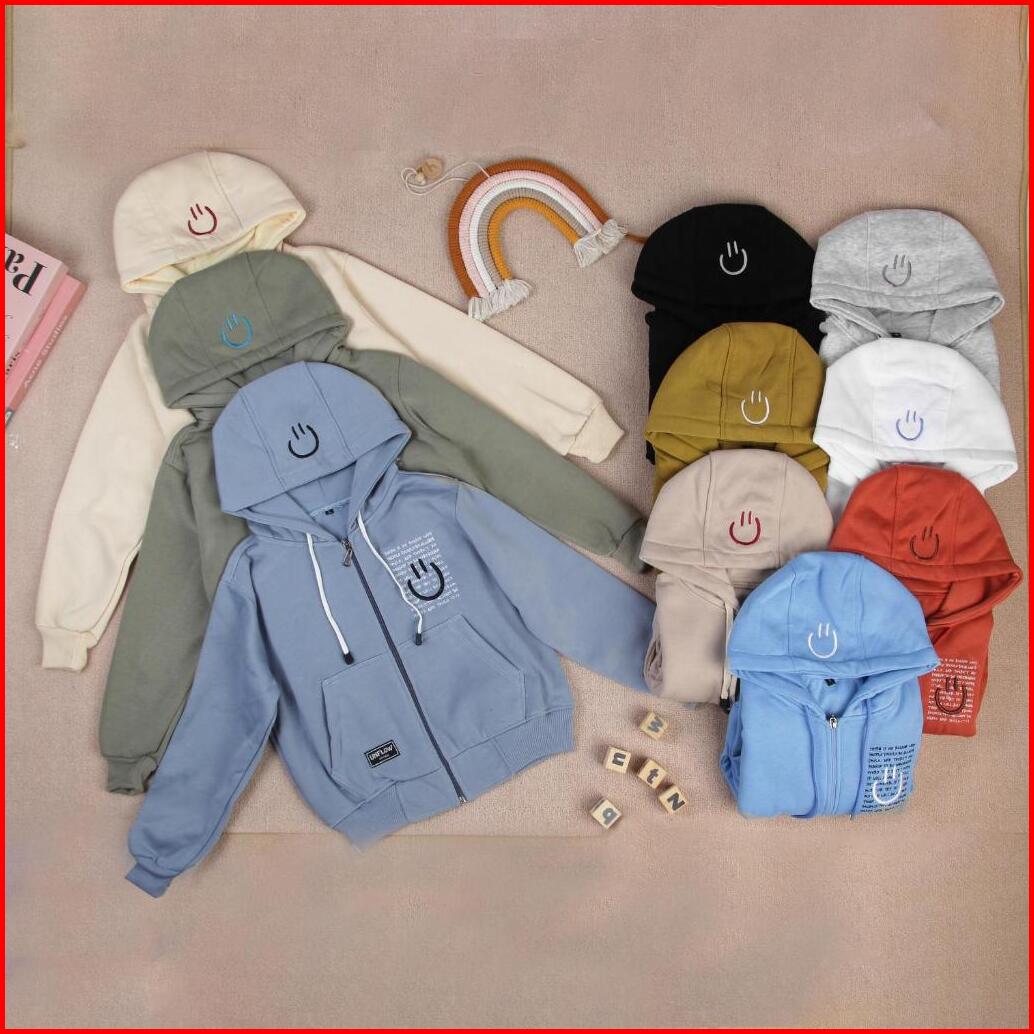 Hoodie Zipper Anak Cowok Cewek Bordir Motif Happy And Smile Bahan Fleece Gramsi Tebal 280