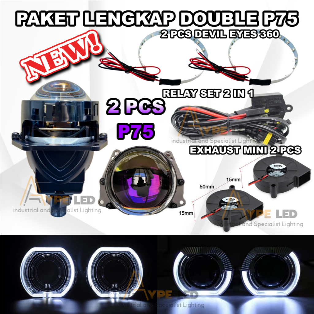 Paket Sepasang Biled Vinyx P75 Ukuran 3 inch Purple Lens 60W/70W Set Complit PNP Motor Mobil P75