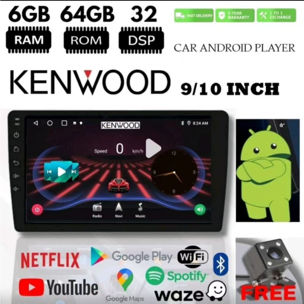 Kenwood Android Head Unit 9/10.1 IPS Touchscreen Car Multimedia Player – Android Auto + Apple CarPlay + GPS Navigation +