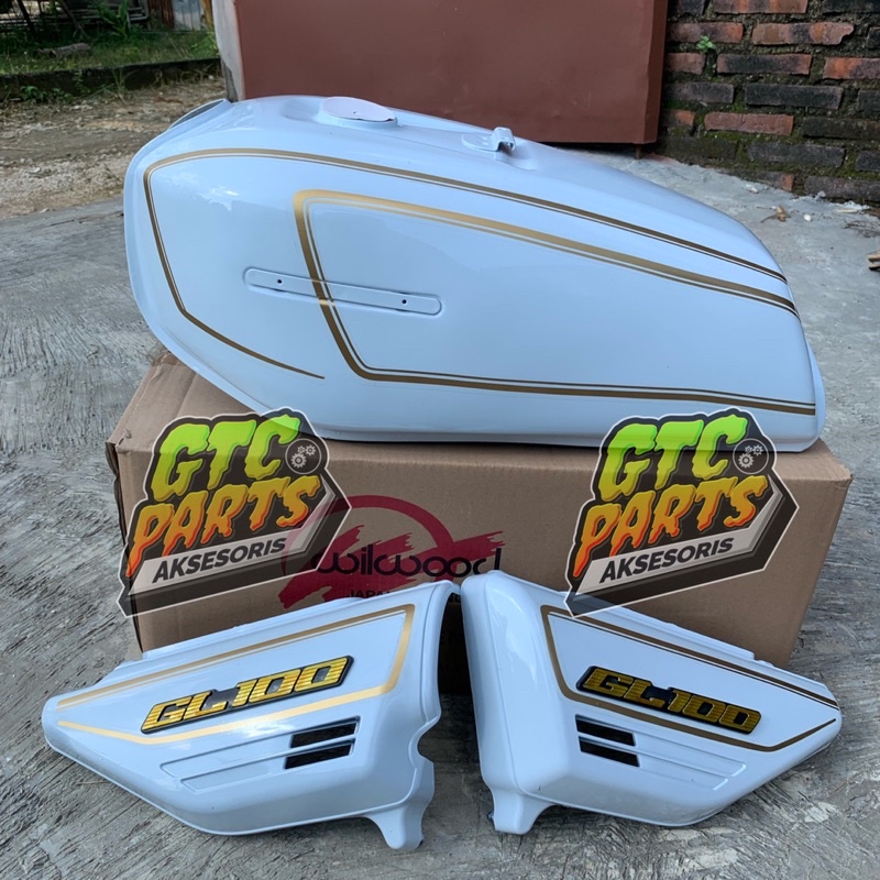 tangki tengki gl 100 pres pabrik warna putih set bok aki gl 100 set emblem tangki gl 100 striping stiker gl 100