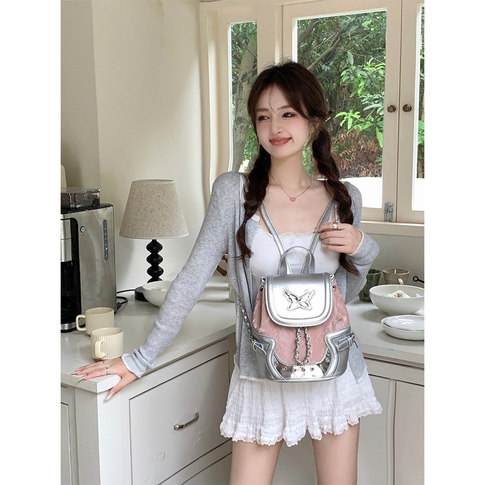 Backpack Y2K Tas Bahu Rntai Tas Wanita Perak Lucu Perguruan Tingg Lucu Import Korea