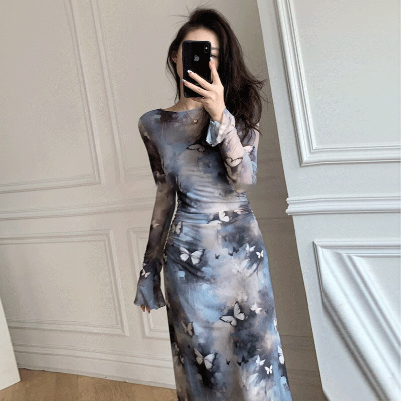 Gaun Mesh Lengan Panjang Motif Kupu Kupu gaun bunga (9194)- G047 - Dress well Wanita Korea 2025 Terbaru