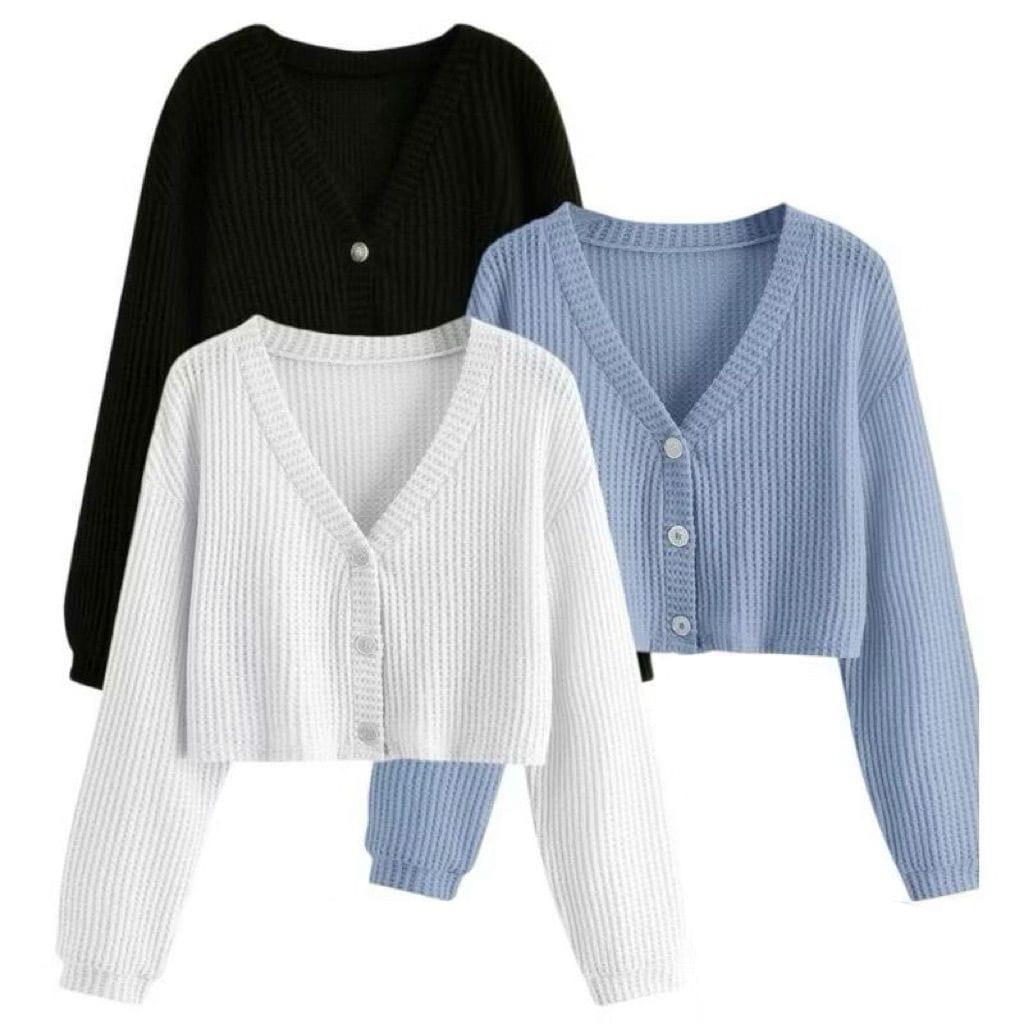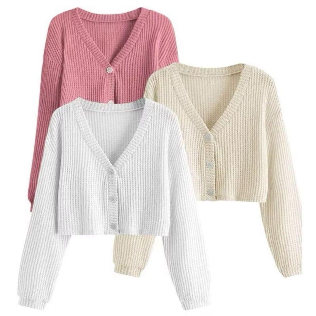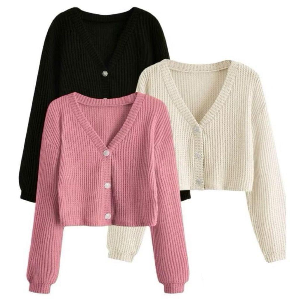 Cardigan Rajut Crop Top Korean Style Kancing Paket 3 Pcs / Sweater Waffle Wanita Lengan Panjang