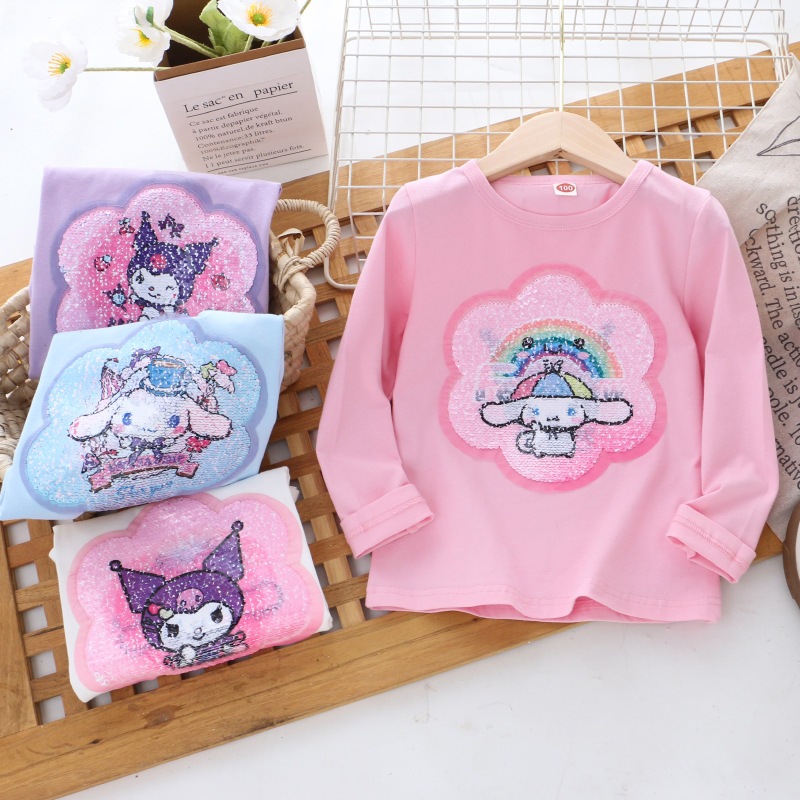 2-8 Tahun Baju Ganti Anak Perempuan Sequin Katun Lengan Panjang Kuromi Melody Princess Atasan