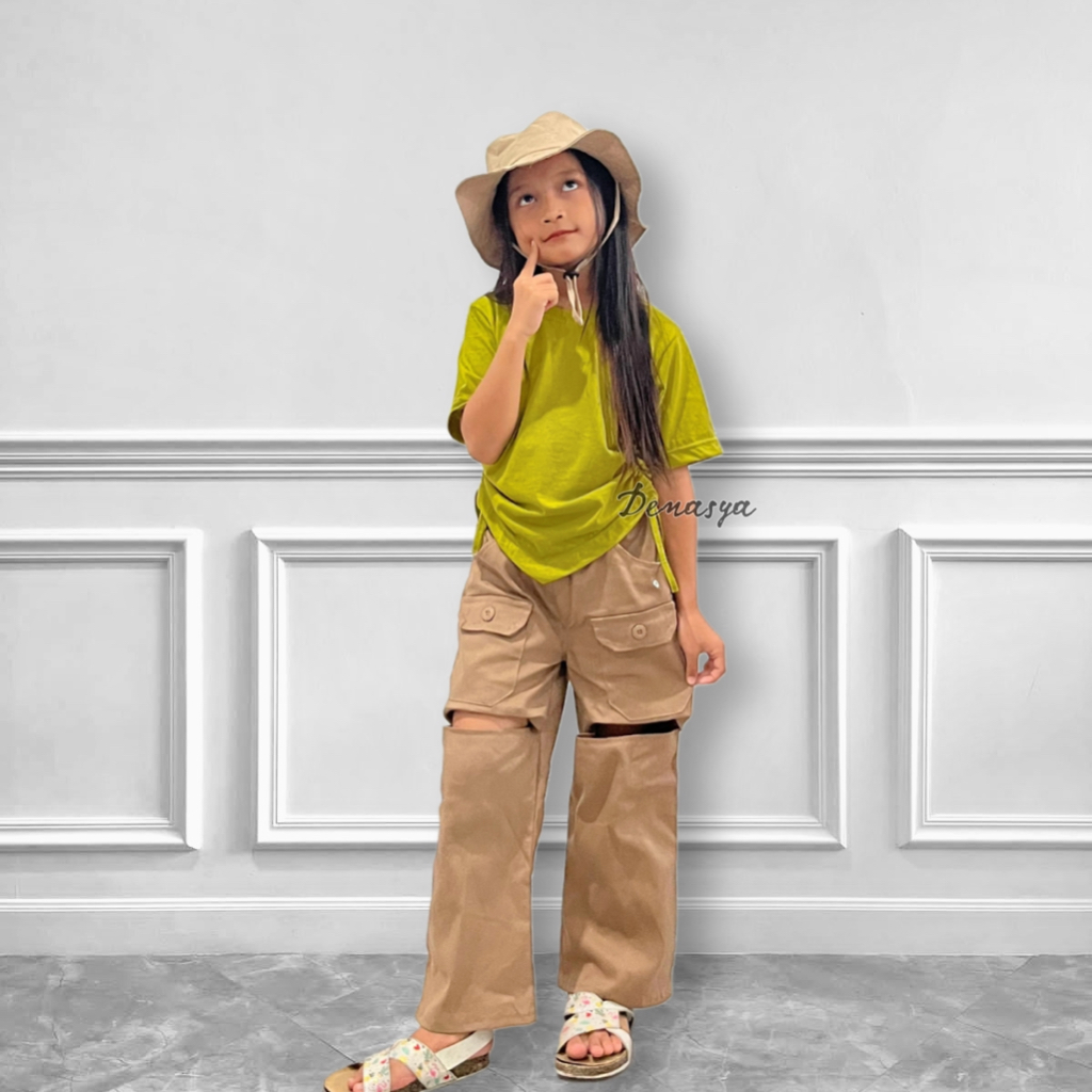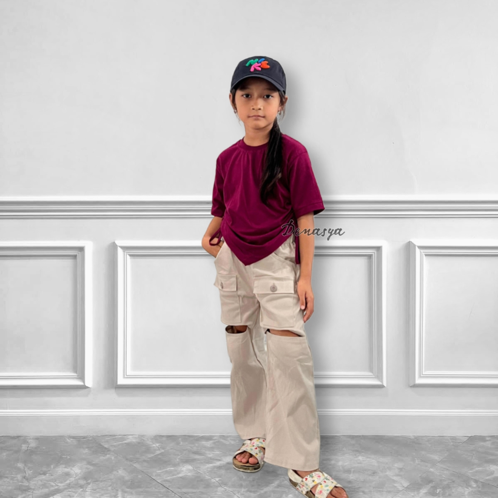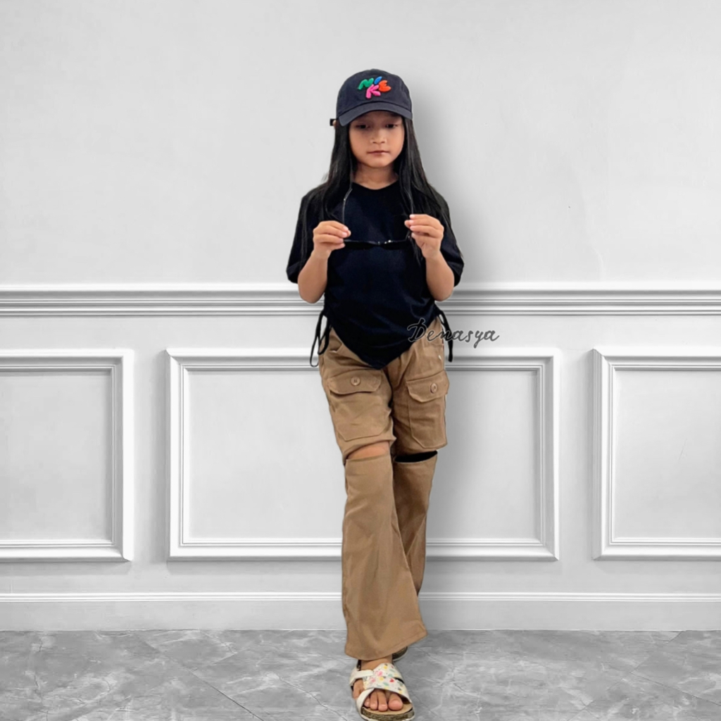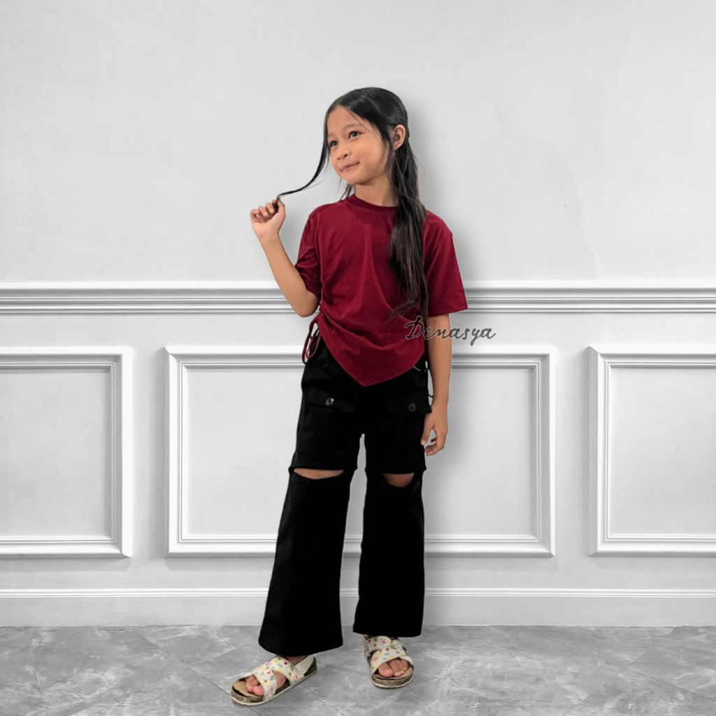 Setelan Kulot Cut Off Pants Anak Kekinian Celana Bolong Kulot Cargo Ade Astrid Viral Kaos Croptop Serut Anak U