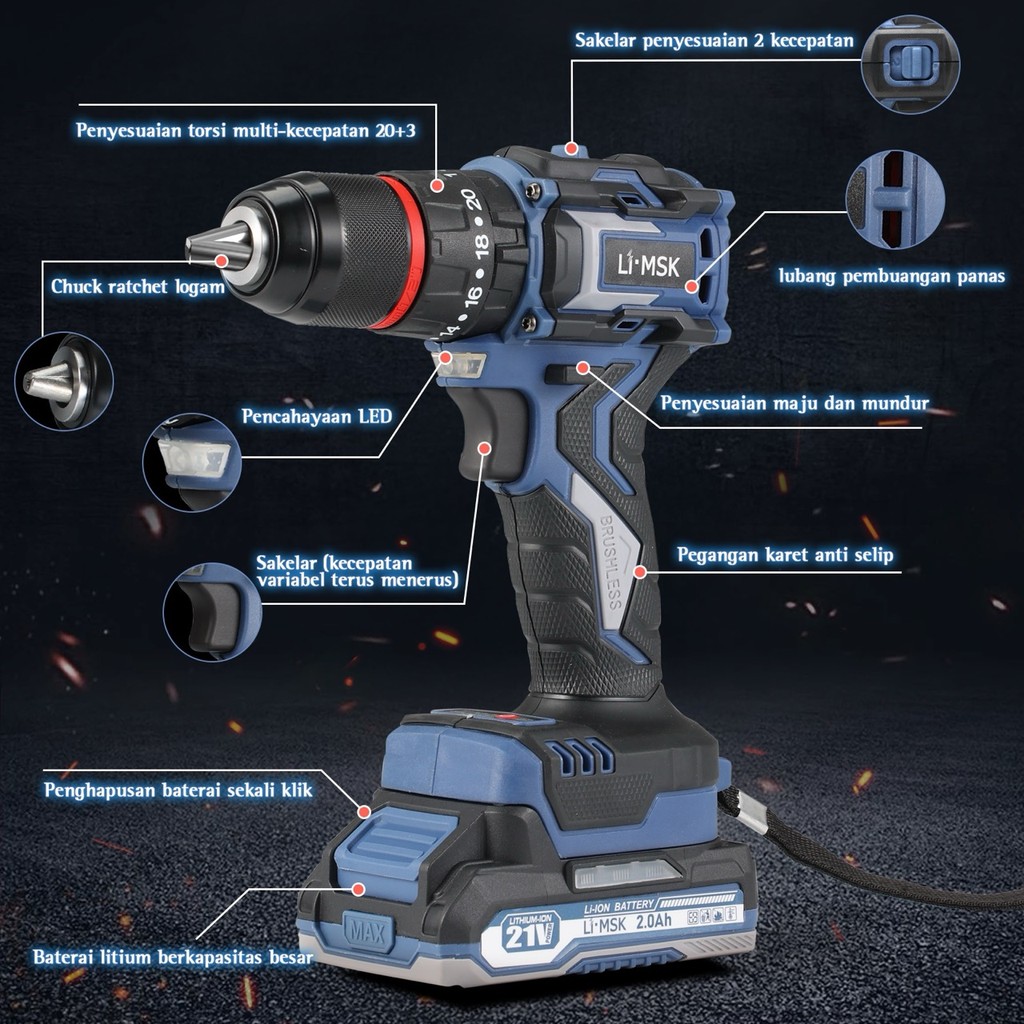 LIMSK LI-1010 Mesin Bor Baterai Brushless 80N.M 13mm Cordless Impact Drill Dapat Mengebor Beton Besi Kayu
