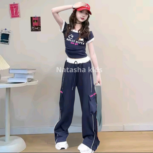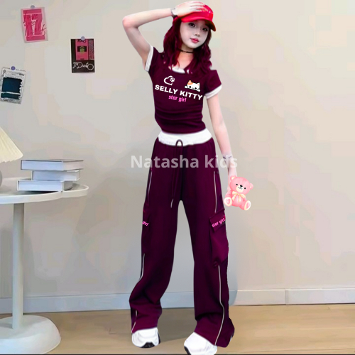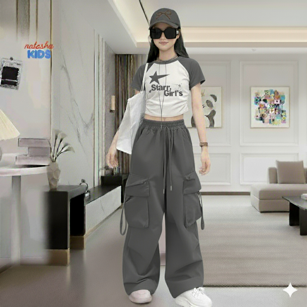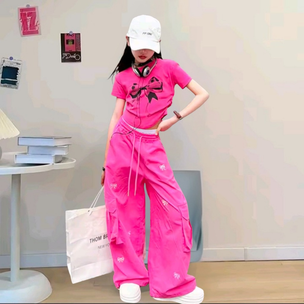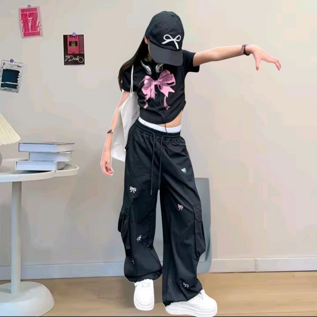 Setelan Anak Perempuan Streetwear Bow Series – Cargo Pants & Kaos Crop Usia 1-12 Tahun