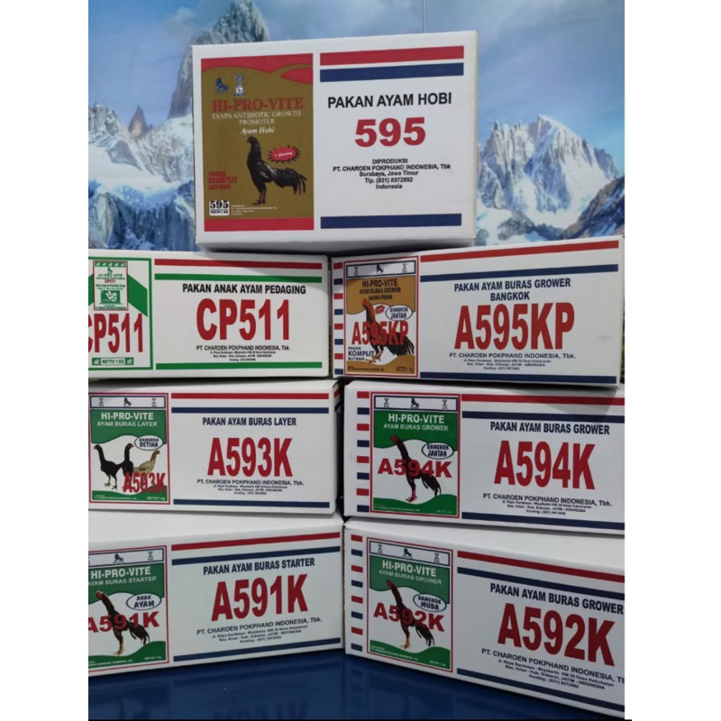 1 DUS VOER PUR AYAM HI PRO VITE PAKAN AYAM BERKUALITAS 511k, cp 511, 591, 592, 593, 594 ASLI KEMASAN PABRIK 1 DUS ISI 20 pcs 1 kg
