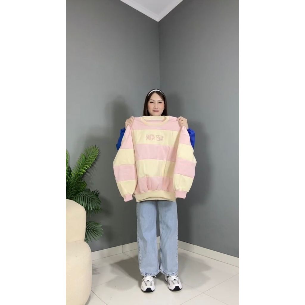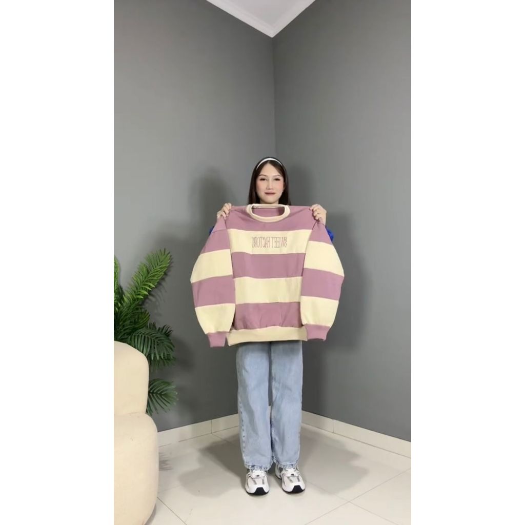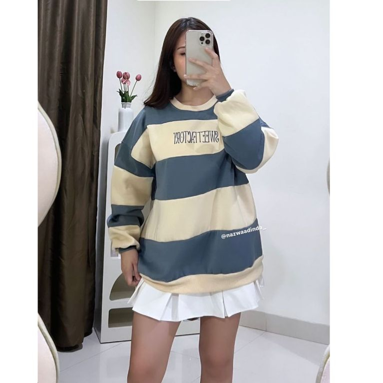 Sweater Crewneck Oversize Wanita Premium Artikel Salur Stripe